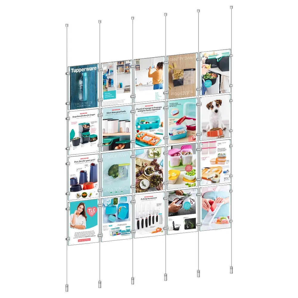 Cable displays are perfect for use in storefront windows, where the (20) acrylic frames help advertise events, real estate listings and more! The poster holders are made from 3mm thick clear acrylic to provide a full view of displayed items, with a dual-sided design to reach passersby both inside and outside of your location! The frames are designed to display A4 (210 x 297mm) posters that are in portrait orientation. The simple slide-in design requires no tools for quick poster changes, as the two side panels can be gently pried apart to put graphics in place. The small embedded button magnets keep posters in place and prevent the frame from opening up.