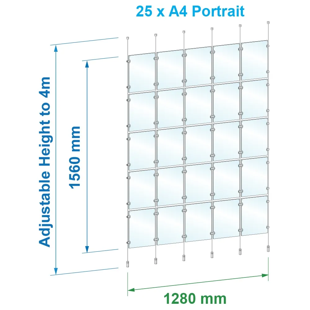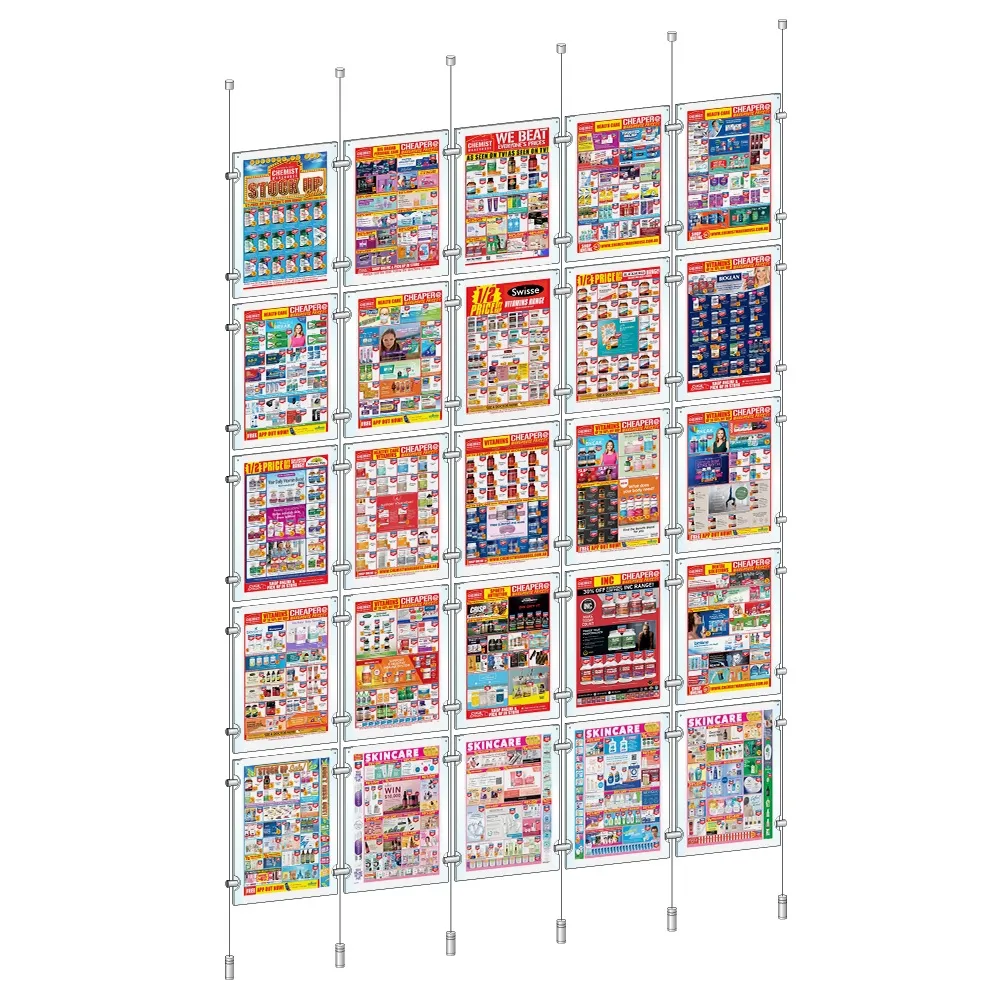 This floor to ceiling cable system is perfect for real estate agencies, retail stores, shopping centres, museums, information centres, and more to display information materials in an eye-catching manner. This display uses a large 5 x 5 matrix of 3mm thick clear acrylic frame with polished edges to showcase your posters. Each of the frames is dual-sided to maximise view, making them perfect for placement as a dividing wall or in storefront windows. The frames can display A4 (210 x 297mm) posters that are in portrait orientation. The easy slide-in design requires no tools for quick poster changes in seconds, and embedded button magnets are used to keep the posters in place and frames closed during use.