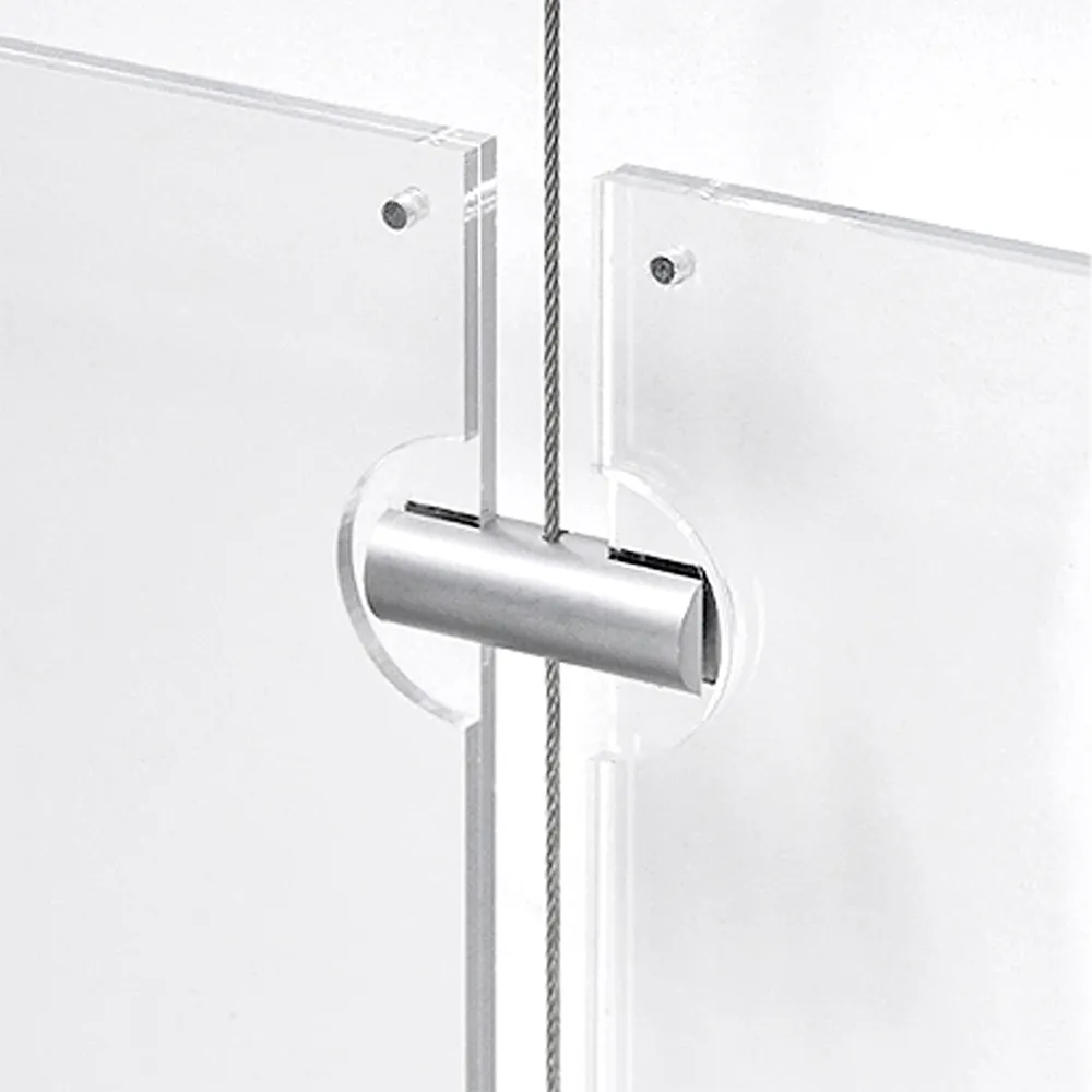 This cable mount is designed to hold (2) signage panels with the singular clamp. The cable panel clamps are made from durable brass, and have a satin silver finish that will work in any environment. The cable fitting, cable mount allows more concise displays to be created, and works really well in a number of locations. The cable mount is found in real estate agency windows, retail stores, office lobbies, hotels, welcome centres, and many more. These cable panel clamps provides reduced hardware cost in addition to a stylish display, as only one of these clamps is required to hold (2) signs!