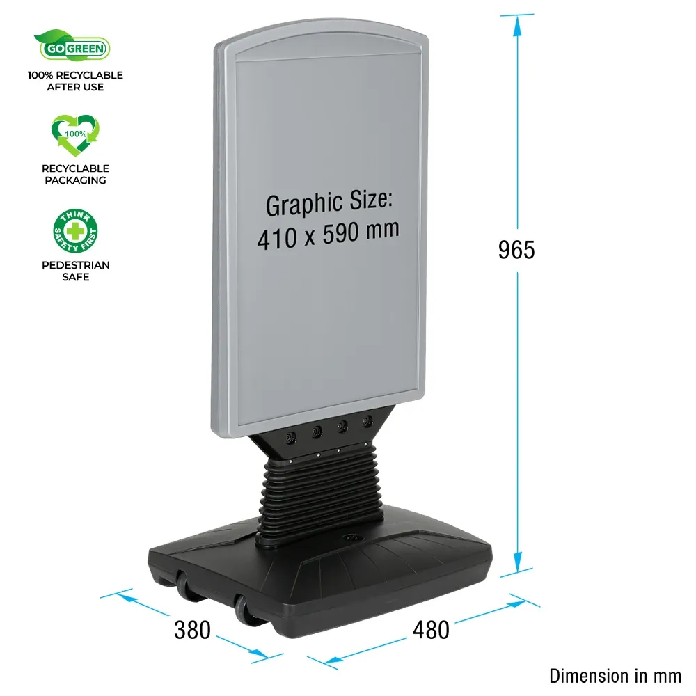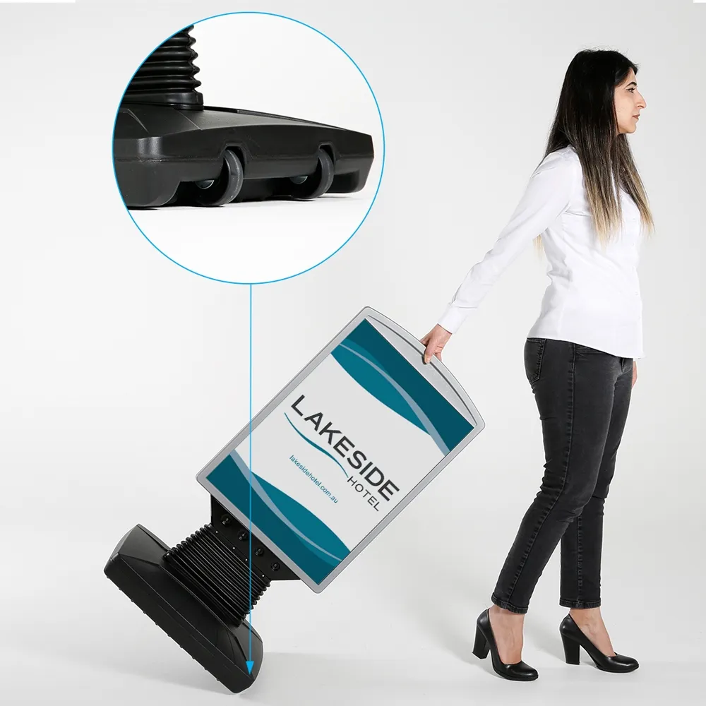 This wind resistant sign, like most sandwich board, has a portable design to be easily placed in desired positions and brought inside after your business has closed. This pavement sign has wheels built into one side of the base to allow you to tip the unit and push or pull it to where you want without having to lift the entire thing. This outdoor sign is designed to hold 410 x 590mm graphics on either side of the unit, with signs that use a self-adhesive back being recommended. 2x custom printed signs are included with the experts at our in-house print shop that makes the stand ready to go out of the box!