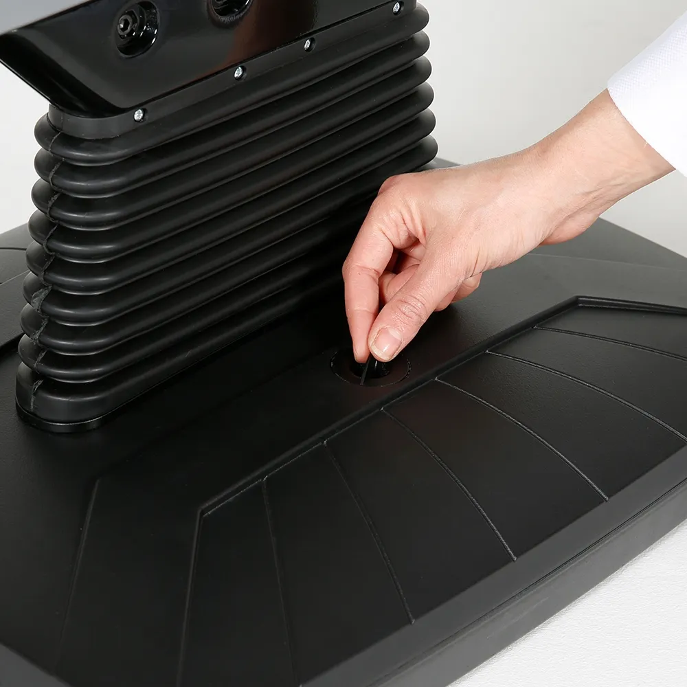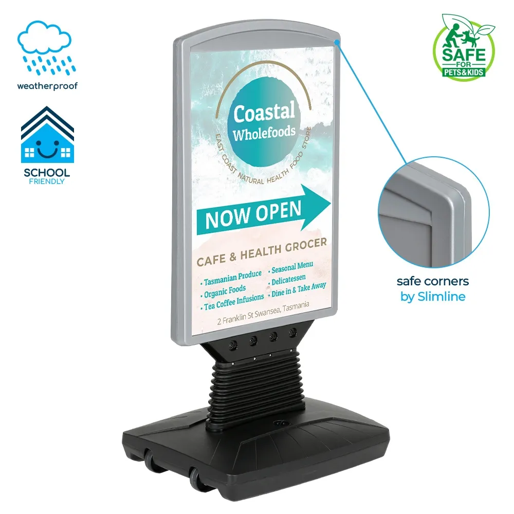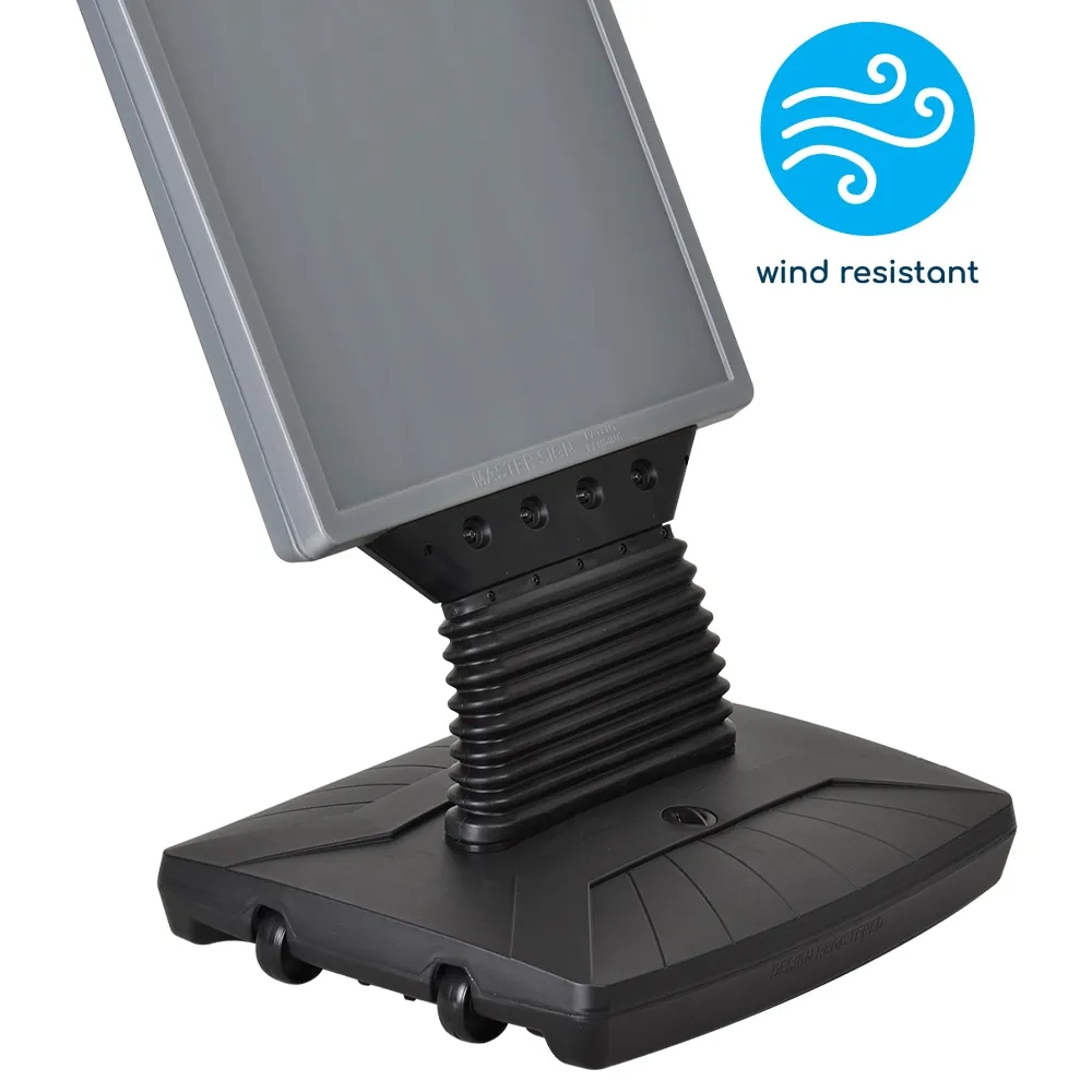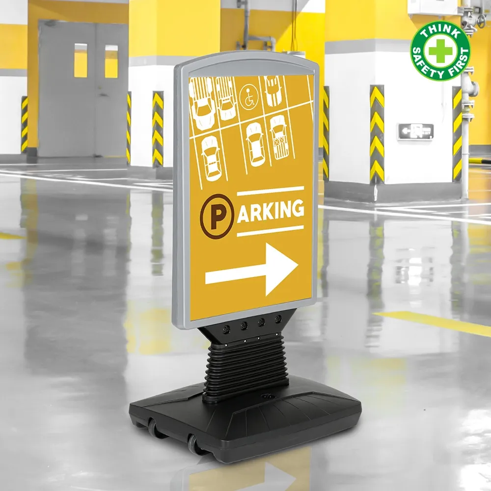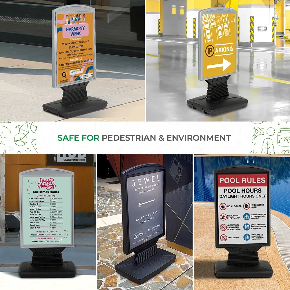 This wind resistant sign is perfect for helping to promote sales, advertise events, and even direct visitors anywhere inside or outside your business! It is shopping center and high traffic area friendly. The outdoor pavement signs has a weatherproof design that allows it to be used even during inclement weather. A large spring attaches the sign board to the base to allow the frame to sway with wind and not be easily blown over during wind gusts. The base can be filled with up to 12L water or sand to increase weight and ensure overall stability. Soft rounded corners and robust yet flexible plastic minimize injury if knocked, especially important in high traffic areas such as shopping centres and schools.