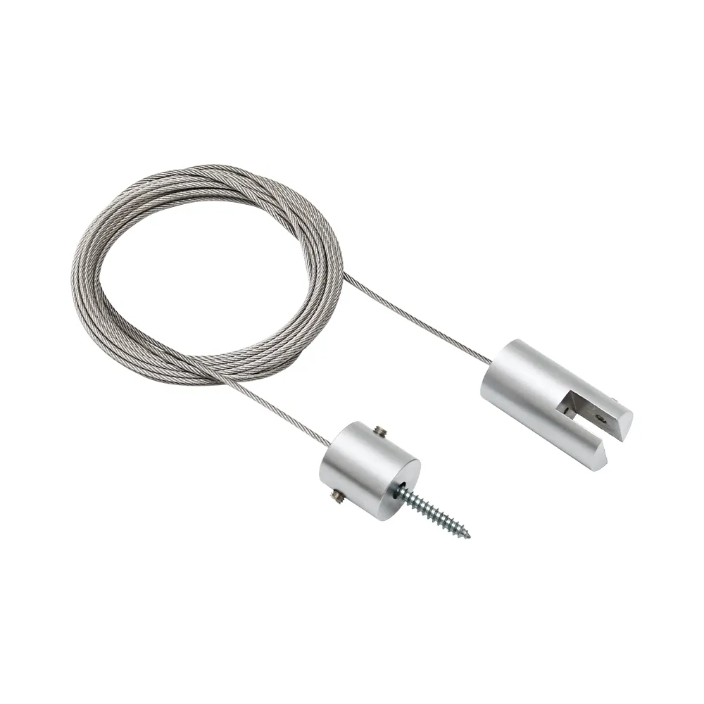 Cable signs, display mounts, and other hanging signs have the necessary installation hardware included. To install the display, simply measure the appropriate length of wire for your needs. Then, attach the ceiling anchor using the provided screw, with the sign gripper attaching using the grub screw and an allen wrench. The cable signs then attach to your signage, again using a grub screw and allen wrench.