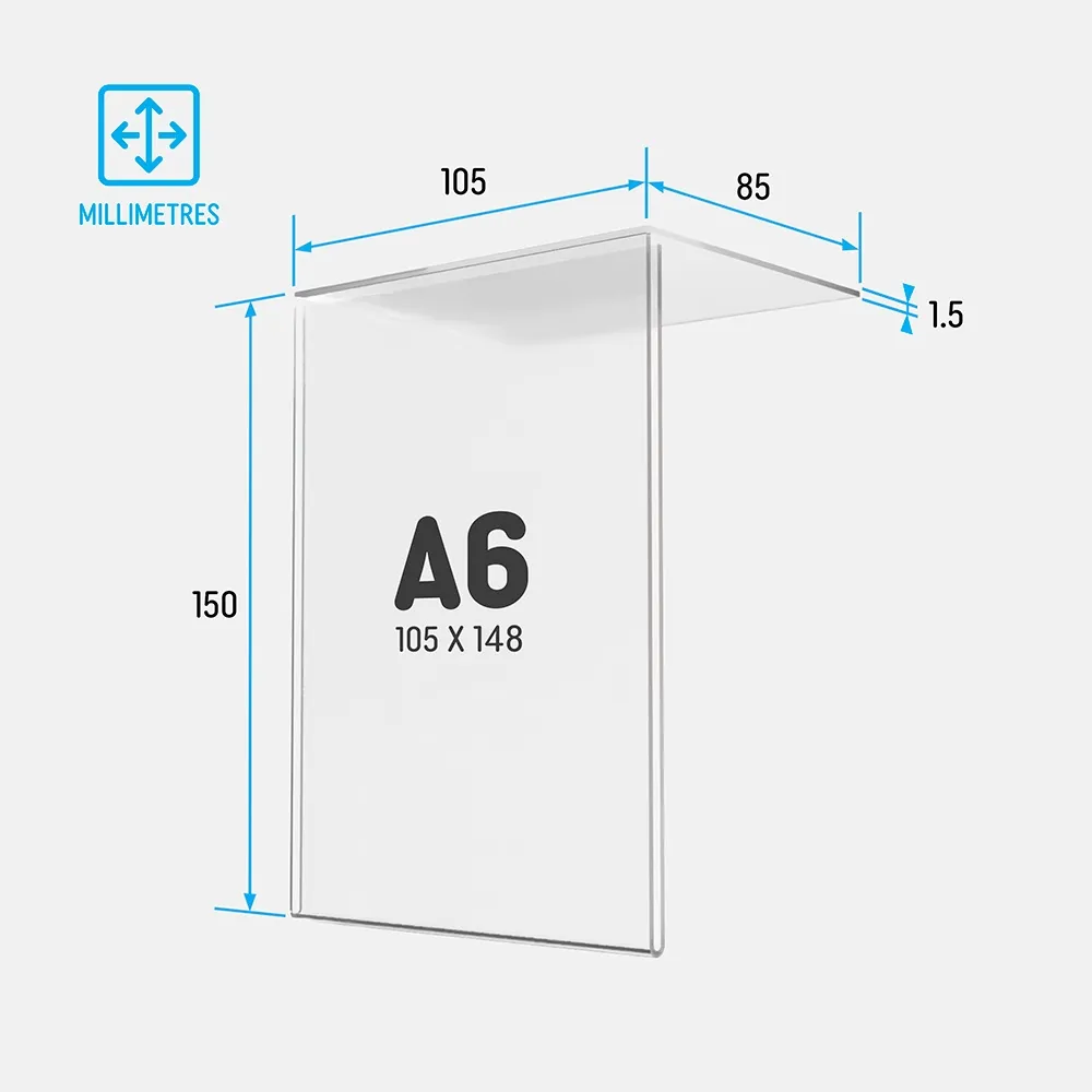 Healthcare clinics, corporate receptions and warehousing teams adopt this A6 countertop display frame for concise communication and bin identification. The format fits neatly on desks, benches and pick-face locations. It is an effective A6 compact sign holder for impulse shelves Australia where clear, space-efficient signage improves customer flow and product visibility.