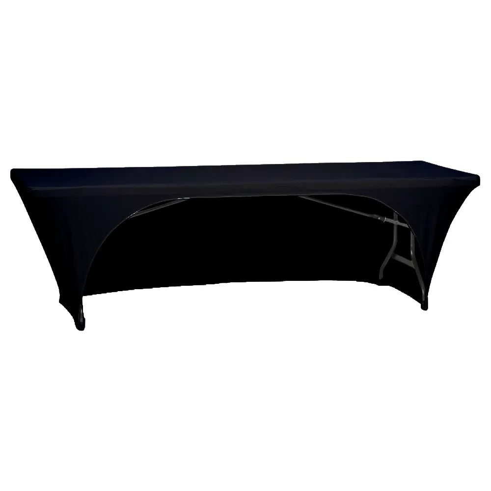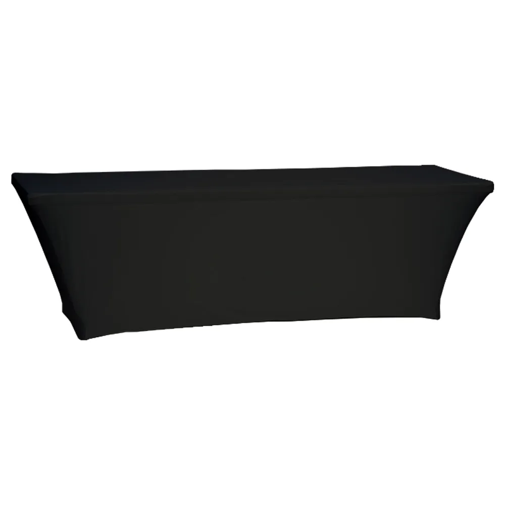 Fitted table covers use a stretch fabric that fits around the entire table to help draw attention from passersby. The black fabric is made from a heavy-weave polyester to be used in heavily trafficked areas without worries. The tablecloth throws, fitted table covers are machine washable and flame retardant for long-lasting use in any environment.