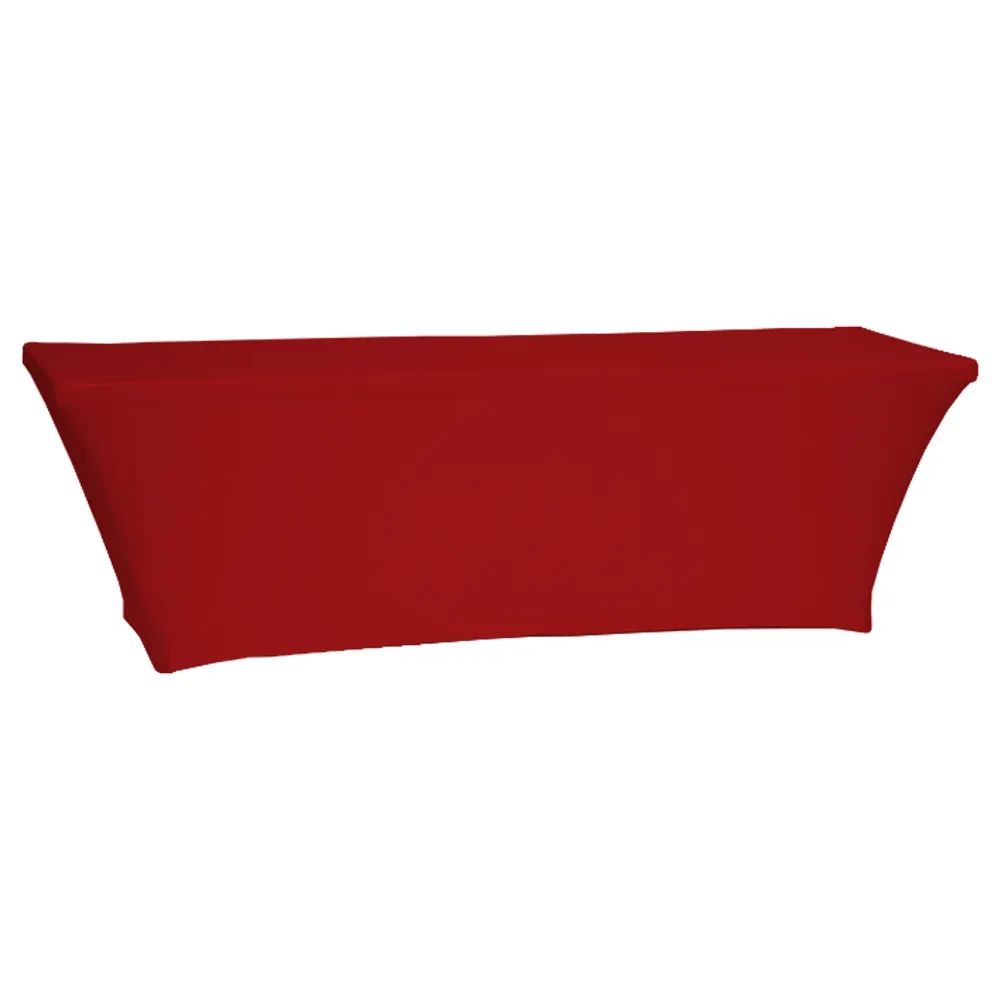 These fitted table cloths are a great way for retail stores, trade shows, exhibition halls, universities and more to interact with customers whilst displaying merchandise, brochures, and other informational materials! The stretch table covers are meant for 8 ft standard sized folding tables that are 2438 x 762 x 737mm, tightly covering 3-sides with the red material. The back is left ope standard-sized tables to offer storage space and a place for personal items as well as legroom for employees. Another benefit is that tables don't have to be in the best condition since the tablecloth will cover up scuff marks.