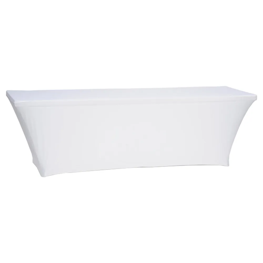 This fitted tablecloth is made from white stretch polyester fabric that tightly grips tables on three sides! This cover is designed to allow discoloured or scuffed tables to be used at different events whilst still looking professional. The front and both sides of the table will be snugly covered by the fabric, with the back open to provide employee legroom and offer access to under the table for personal items or item storage. This table cloth is great for use in retail stores, exhibition halls, universities, information centres, trade shows, shopping centres, and other locations to make interacting with passersby and potential customers a pleasant experience.
