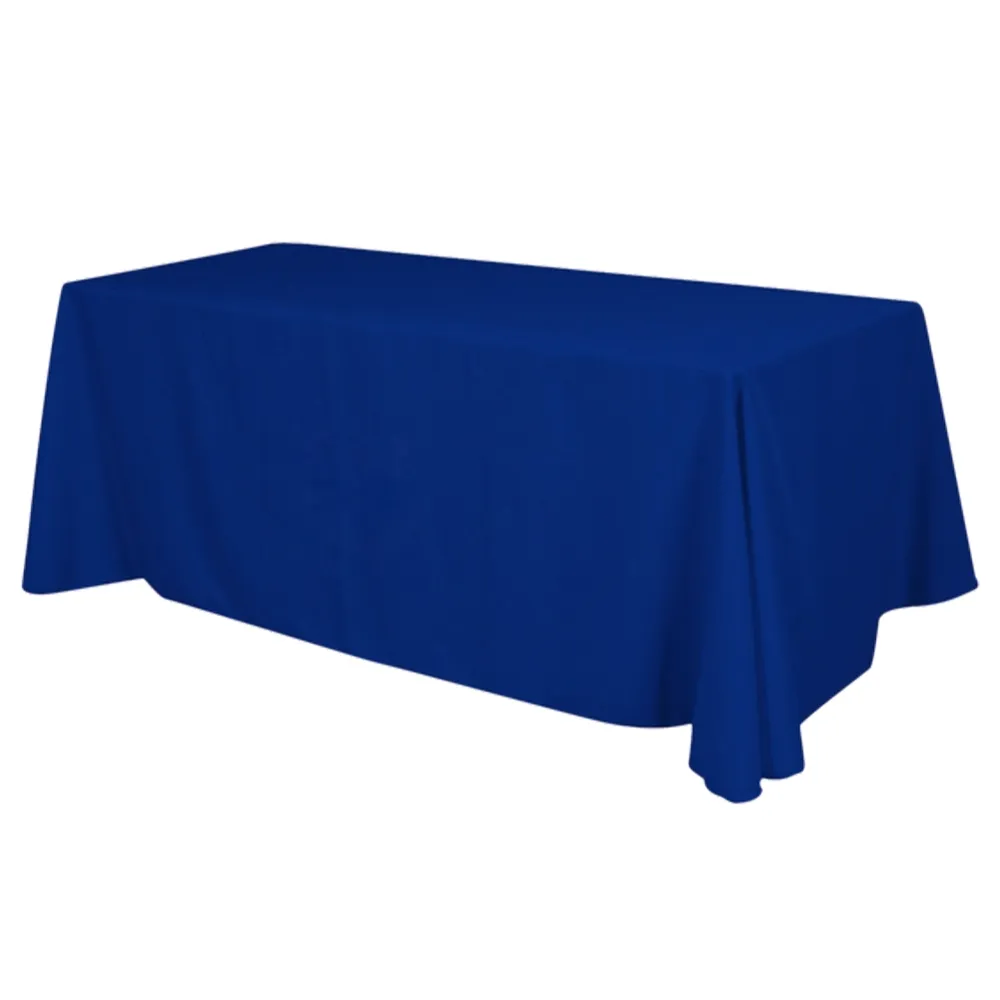 Trade show table drapes are an easy way to make any table presentable at retail stores, shopping centres, exhibition halls, information centres, and more! The tablecloth is made from blue polyester fabric that is machine washable to be easily cleaned before events and fire retardant to be safely used in any location. The blue colour is striking and helps draw attention towards the table whilst keeping any scuff marks or damage to the surface hidden from view. This allows any table to be used even if not in the best condition, as long as it is stable it will look new using one of these blue table throws. Tablecloths are also offered in red, black, and white colours in 6 ft or 8 ft options in this style, with additional styles offer 3-sided throws and custom printing to have logos placed directly on the fabric!