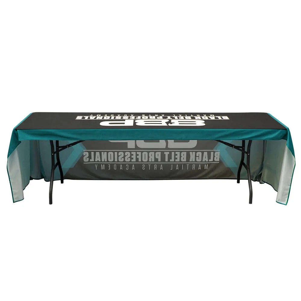 Trade show tablecloths, table coverings, and table throws hang down over (3) sides of the table, an economy design. The open sides allows for easy access to storage, as well as provides legroom for seated employees.