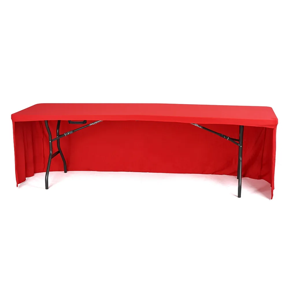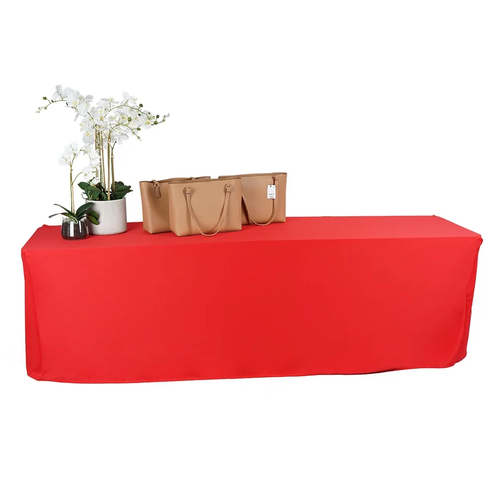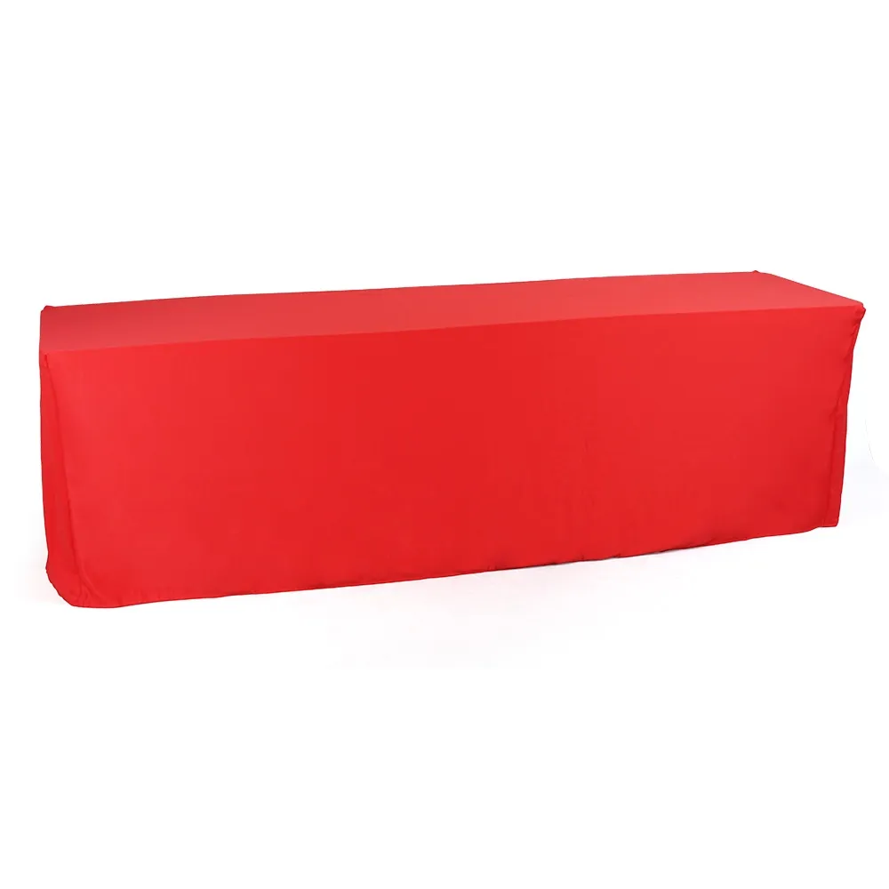 This table throw allows any table to be used at events or within retail stores, information centres, universities and more as the fabric helps to obscure scuff marks and other damage to tables to present a professional appearance! This tablecloth is made from hard-wearing polyester and is red in colour to offer a pleasing look that works well in a variety of locations. There are also blue, black, and white colour options in this style in both 6 ft and 8 ft sizes to best work with your needs. We also offer custom printing on these throws to have your logo and branding directly on the fabric in full colour!