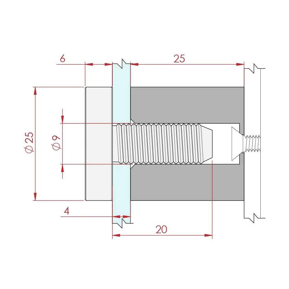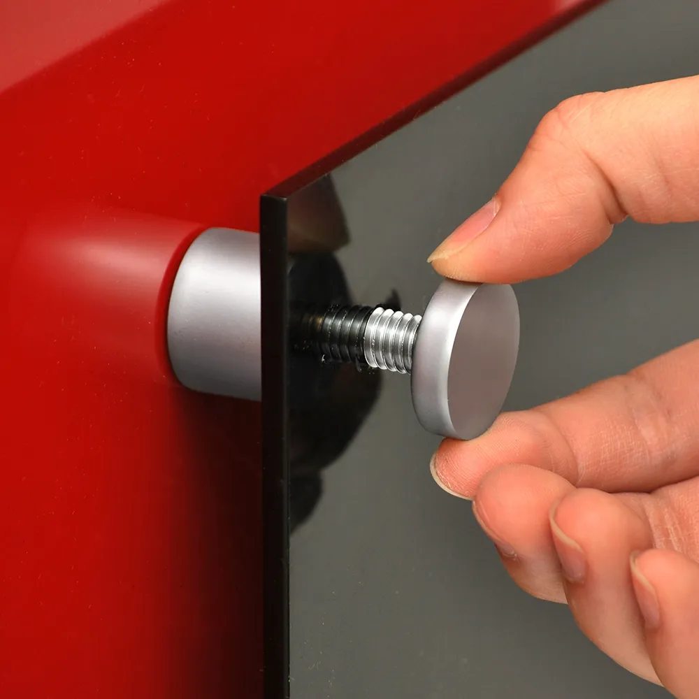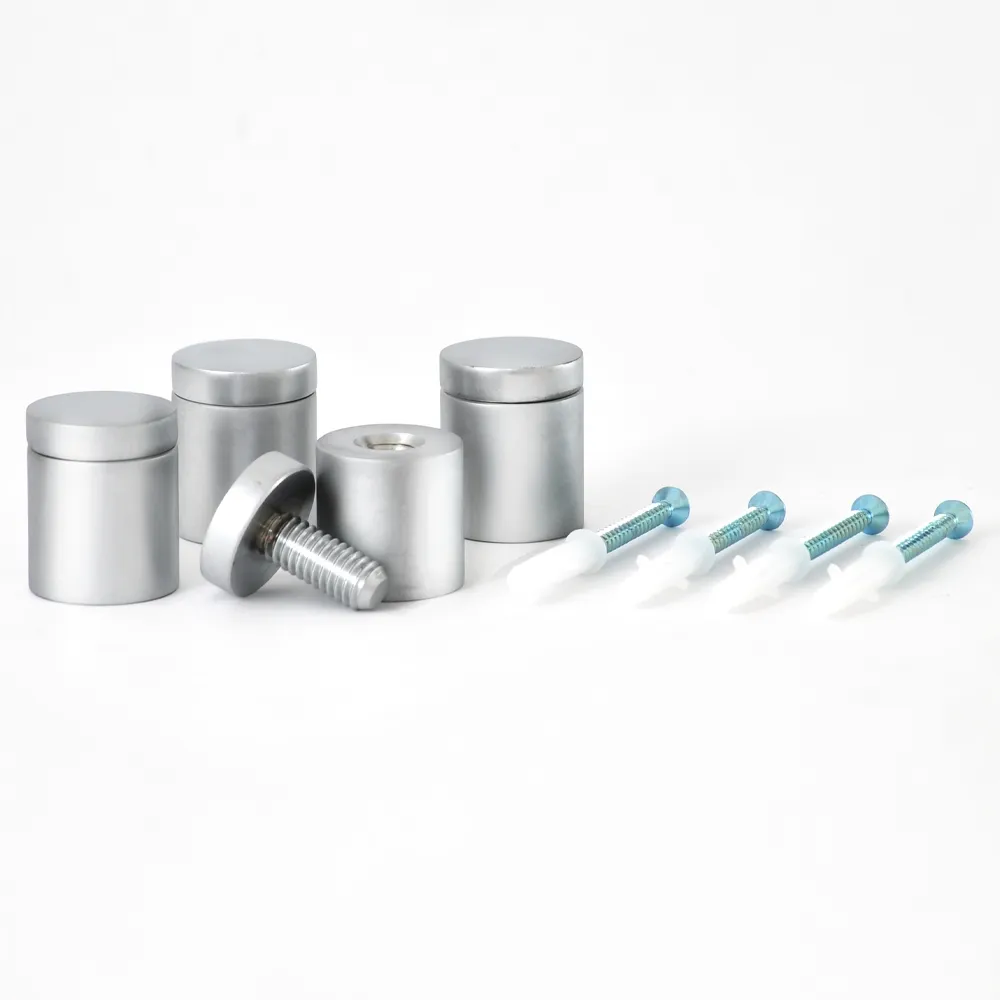 This sign stand off has a satin silver finish to easily fit in with any location. The brass panel clamps have a through design that requires a 9mm hole to be drilled through your signs. The flat top mounts are hand-tightened once installed on your wall to secure the signs.