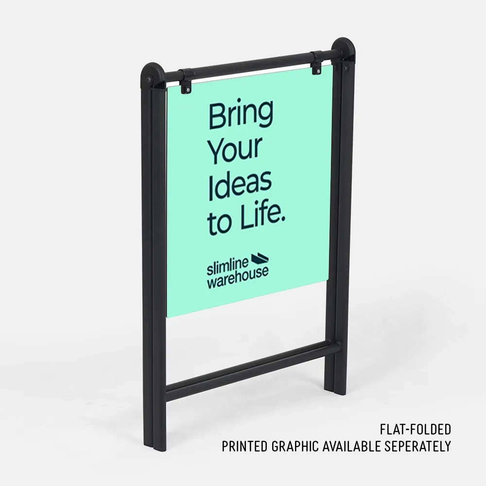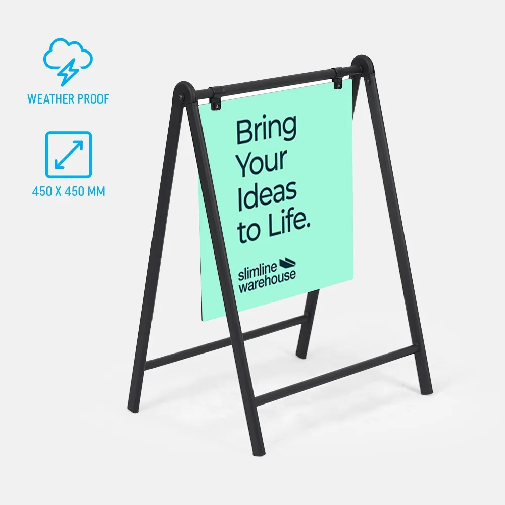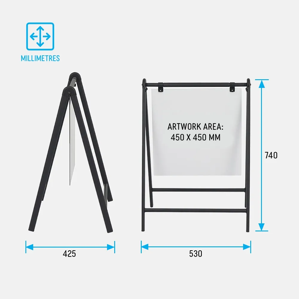 - Swing sign features dual-sided 450 x 450mm board with custom printed graphics!
