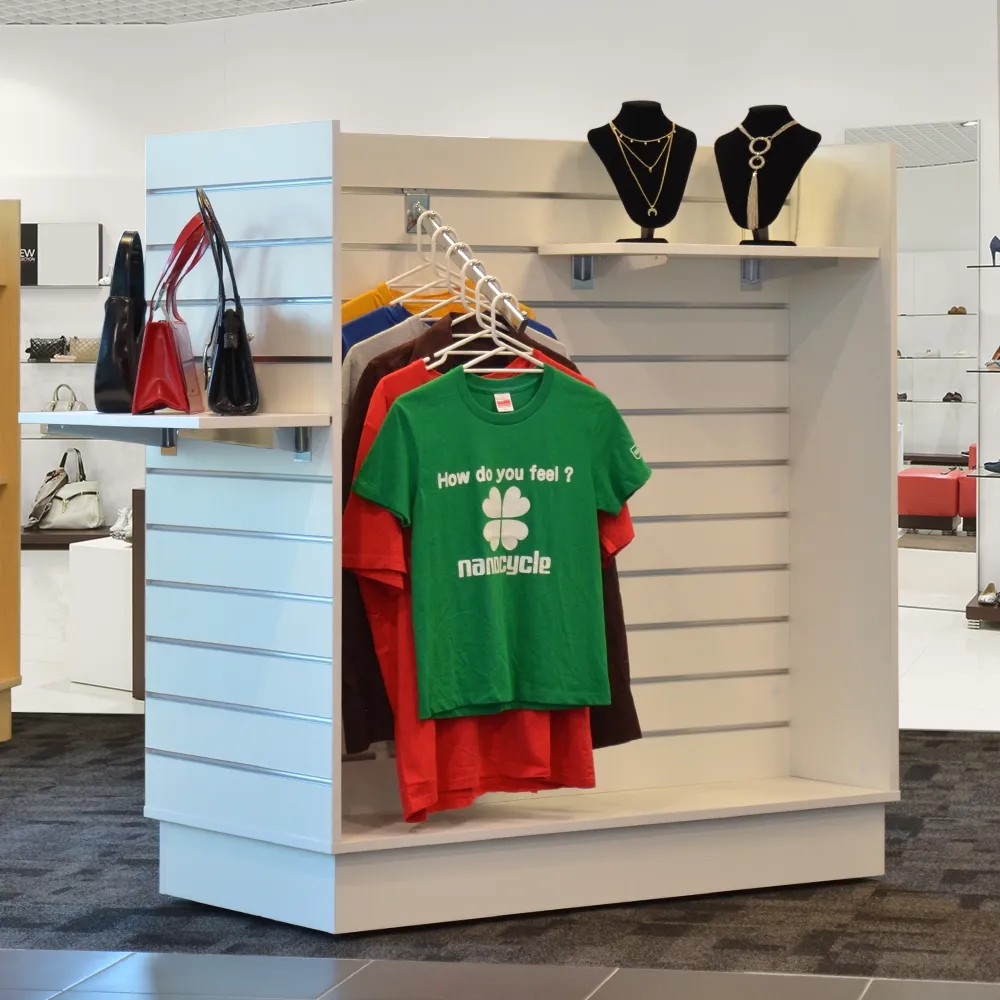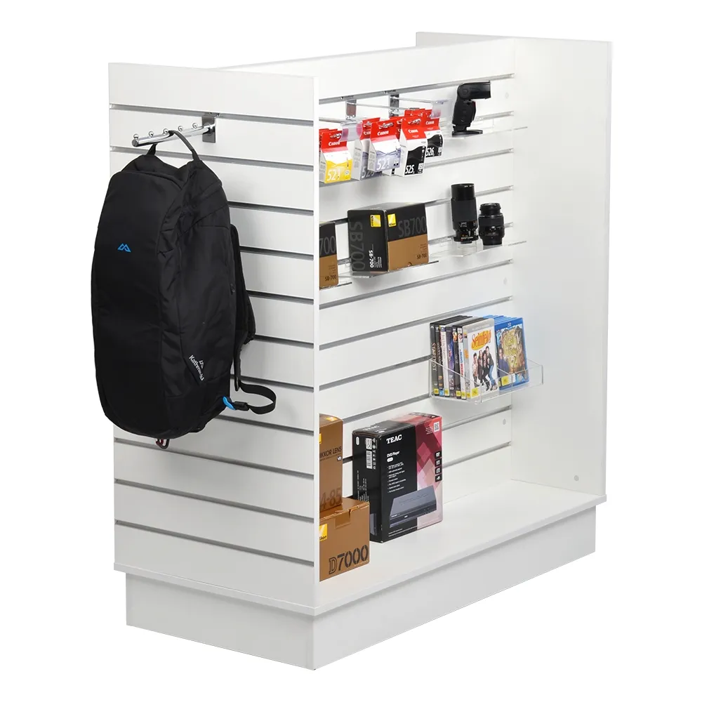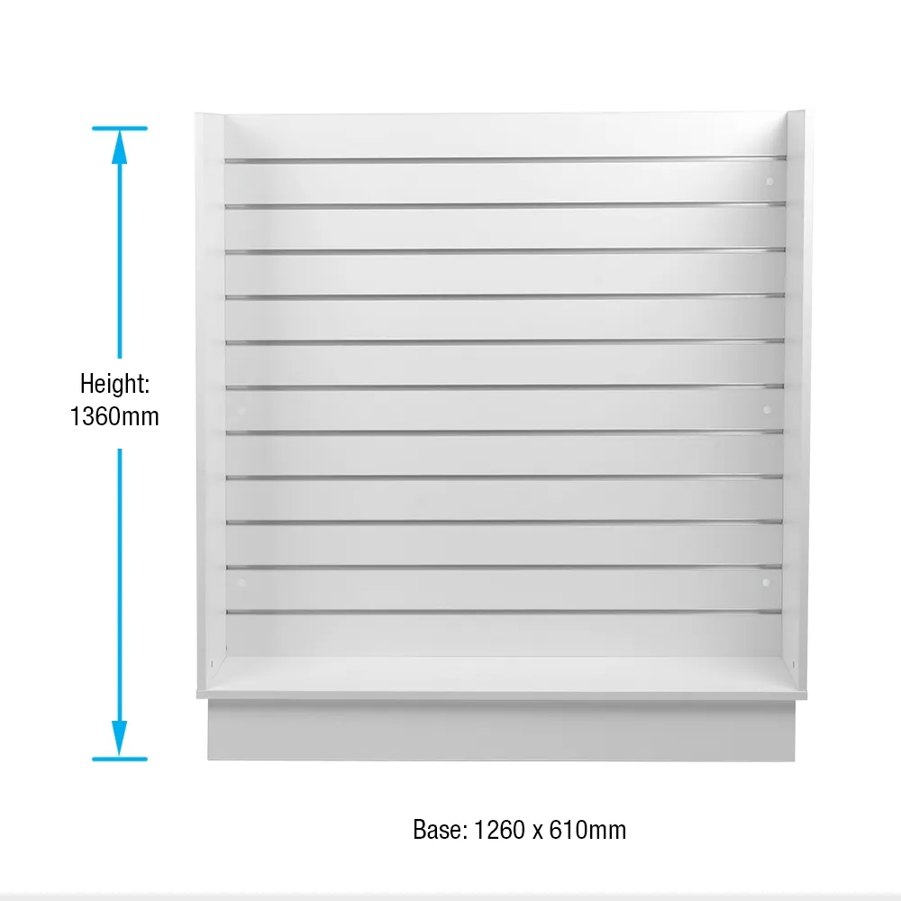 These slatwall store fixtures, like merchandising stands, help you to display goods at your store in a contained space that promotes and encourages sales! The stand is made from MDF and has a white finish for a professional look that will match well with decors in book stores, shopping centres, gift shops, retail stores and more. The slat channels themselves are made from alumimium for a reinforced display that securely keeps display fittings in place during use.