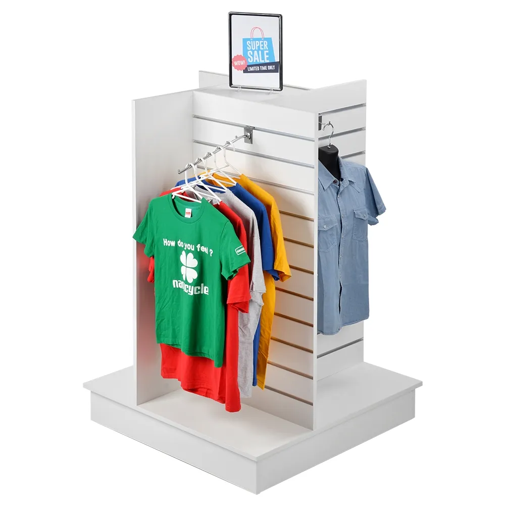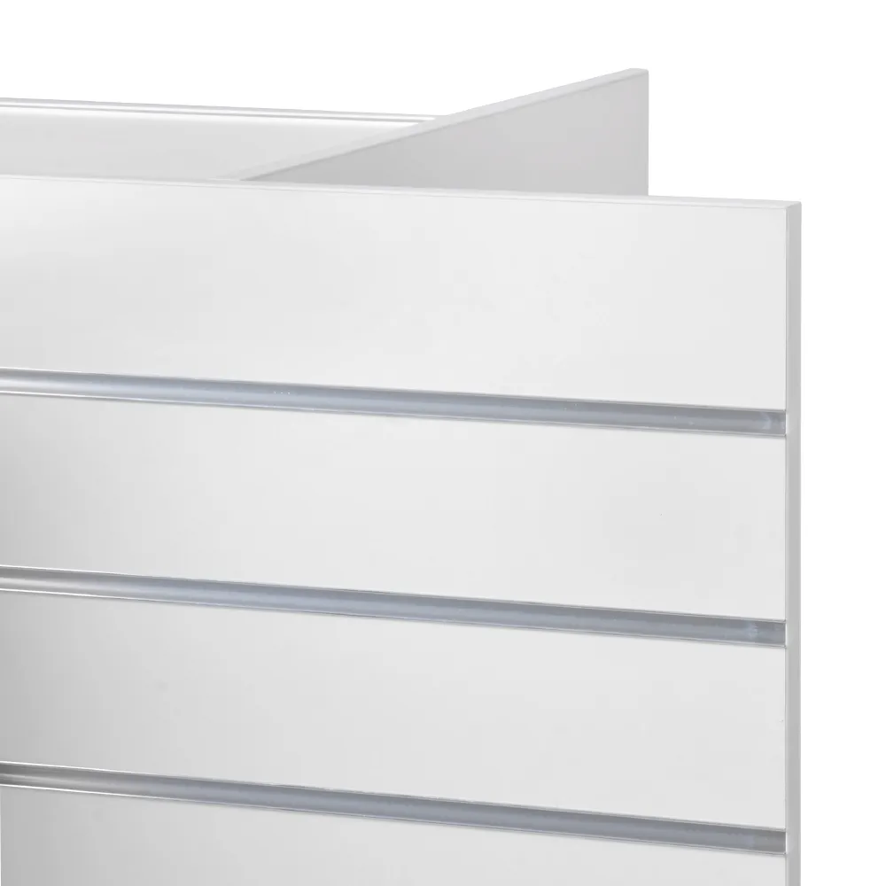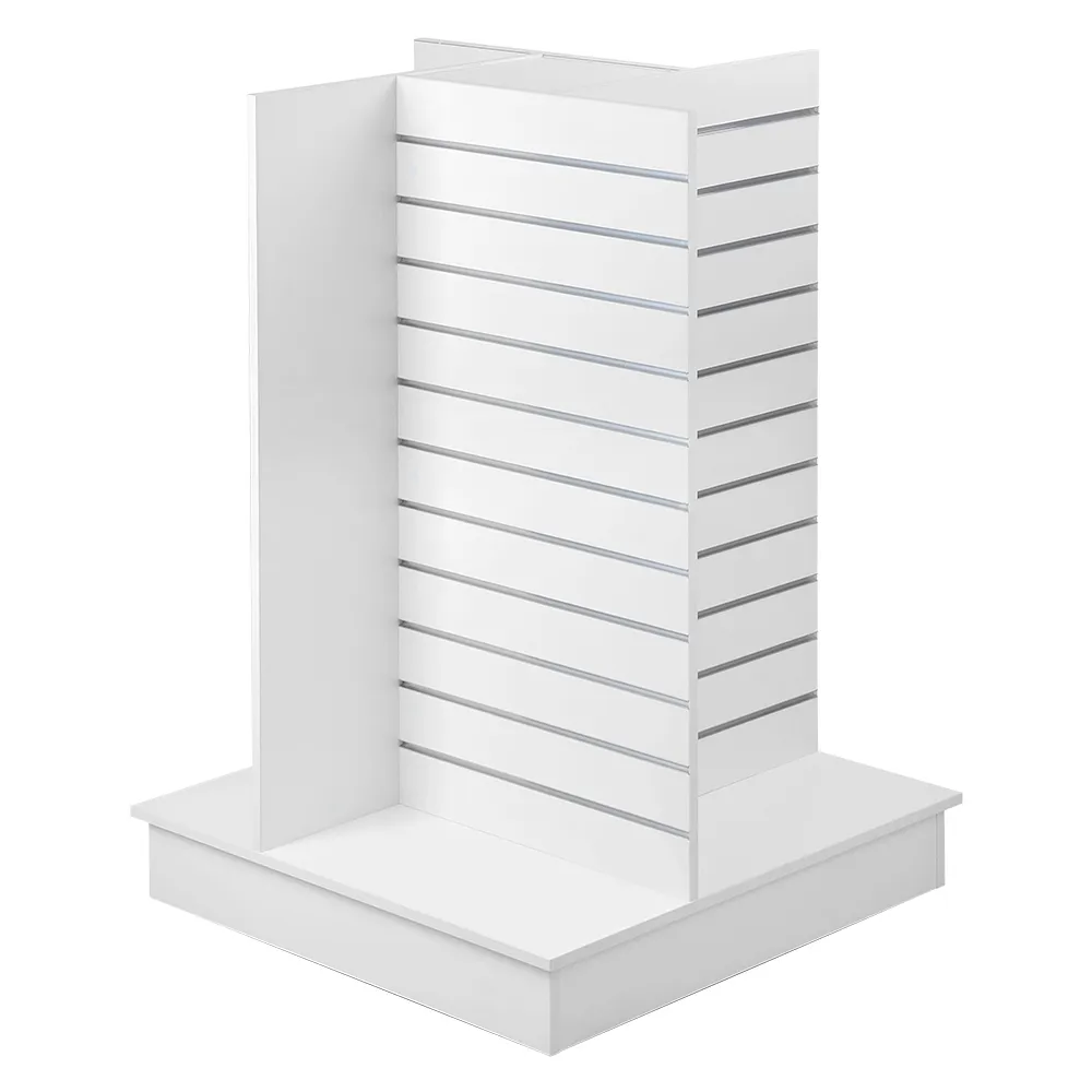 This slatwall floor display is perfect for holding a wide variety of merchandise at your store in a contained space. The slat wall gondolas feature a pinwheel design that effectively separates different product lines whilst still keeping them close together to help lead customers to similar items. The 4-sided stand has a 610 x 1200mm slat wall panel on each side for holding products using hangers, hooks, shelves, and other slatwall accessories. Each slat channel is made from aluminium to securely hold fittings in place whilst complementing the white finish of the MDF stand.
