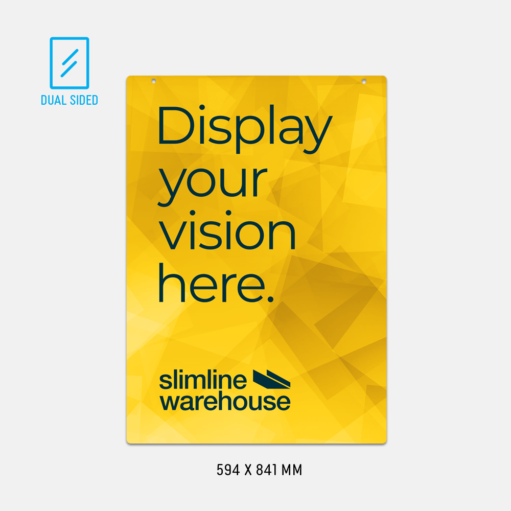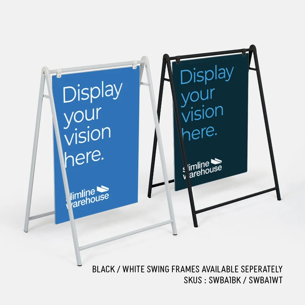 The custom swinging A1 signage is made from 3.5mm thick aluminium to provide a durable display that holds up well inside or outside for years to come. Holes are cut-out at the top of the white aluminium panel to make sure installation is quick and easy with your existing swing sign. Order from Slimline Warehouse today for quick shipping to anywhere Australia-wide!