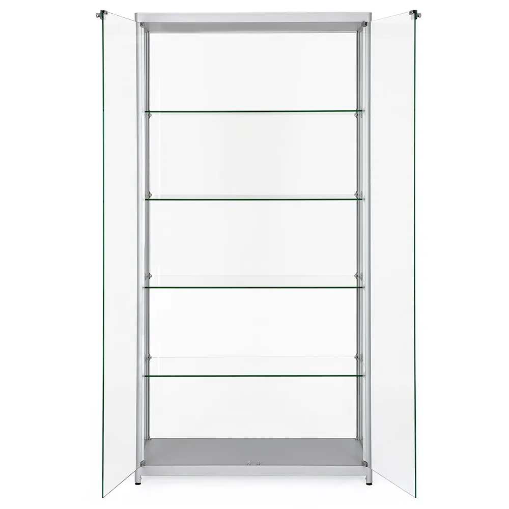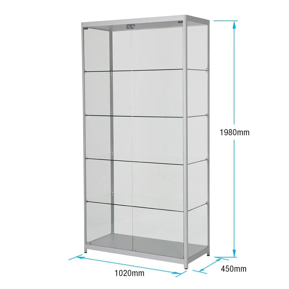 Commercial display cases, part of our line of retail showcases, are large in size to display plenty of items within a secure cabinet. The 1980 x 1020 x 450mm unit features multiple shelves in order to hold many items in a single place with a smaller footprint, even with a cabinet as large as this one. There are (4) adjustable 965 x 415mm shelves made from 7mm thick tempered glass that can each support up to 40kg, ample weight for typically displayed items with this fixture. There is 365mm between shelves to display items, with the door opening at 1850 x 475mm when both swing doors are fully open.