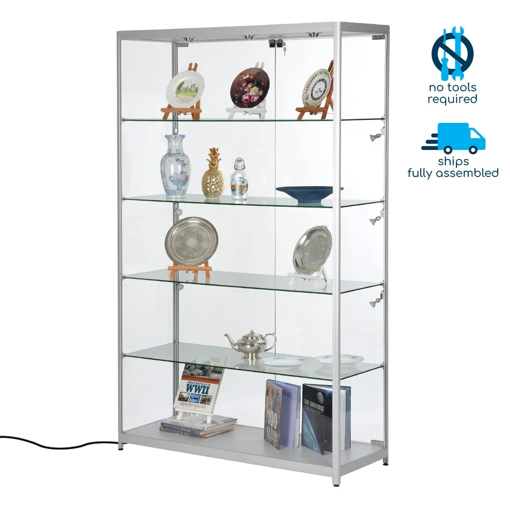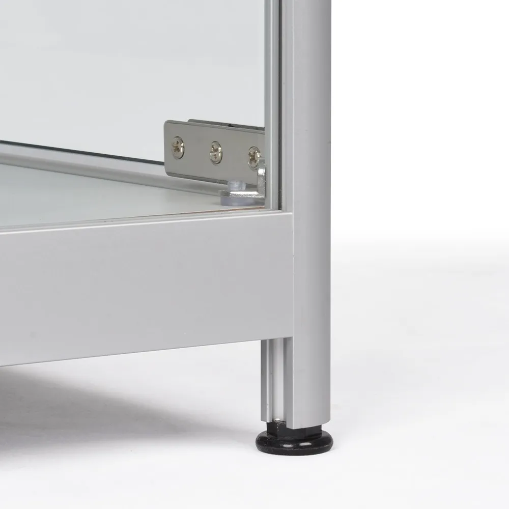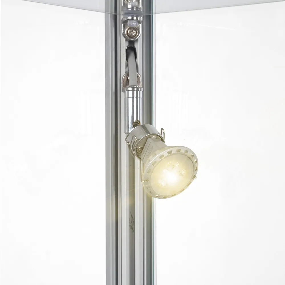 The tall glass display case, one of many retail showcases on offer, uses (4) tempered glass shelves with green tinted edges to create a tiered display to maximise space. Each level is 1165 x 415mm to hold items that are up to 360mm tall. The bottom level has the same MDF base with silver finish as the top and bottom accents to match the aluminium frame. There are LED lights within the showcase as well to illuminate displayed items using a cost-effective and environmentally friendly lighting source. The top of the cabinet has (3) 2.5-watt lights that brightly illuminate the entire cabinet, with (6) adjustable 2.5-watt lights on the side allowing for individual spotlighting.