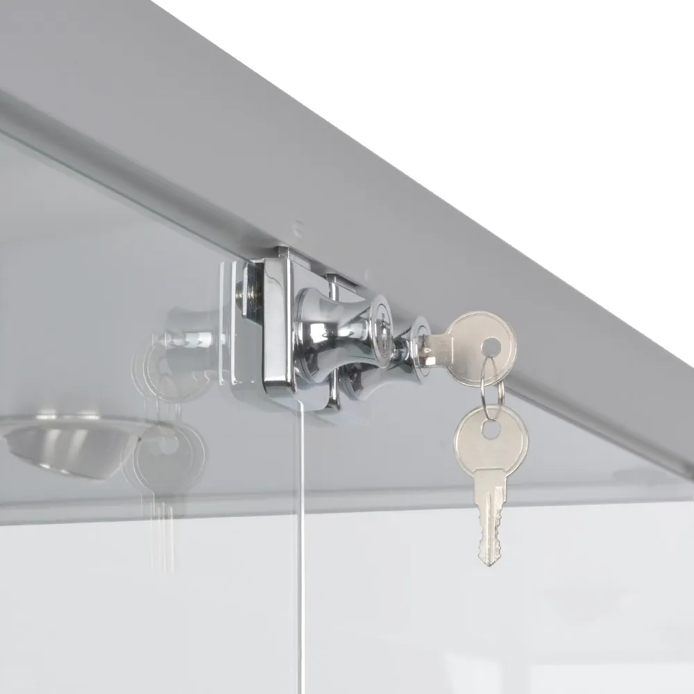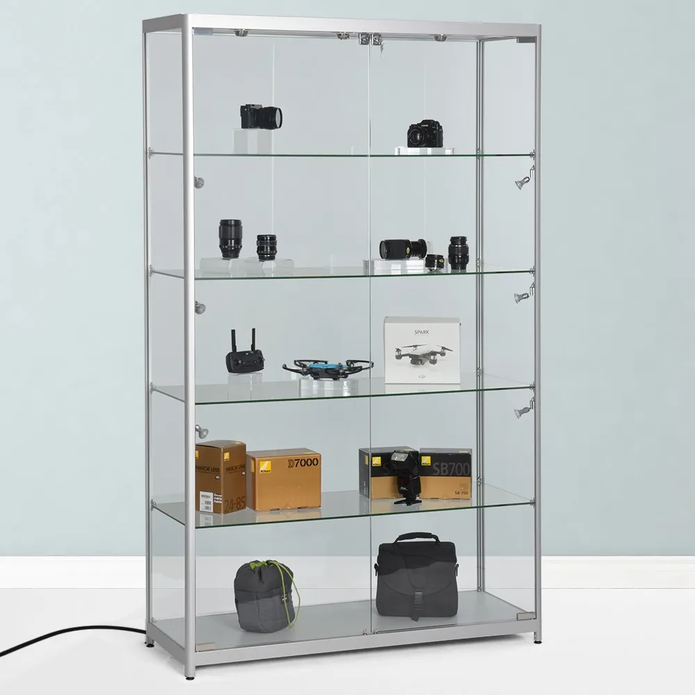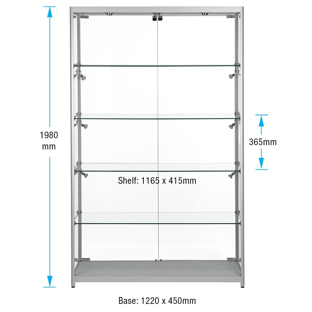 A tall glass display case is used to showcase trophies, art gallery pieces, artifacts in museums, merchandise in stores and more. This 1.98m tall display offers heaps of room for a variety of items within, and has a 1.2m width and 450mm depth. The frame is made from aluminium with a silver finish, offering a durable display that complements the 8mm thick tempered glass sides and 6mm thick glass doors. The lockable display has secure hinges and locks built into the top of the doors to help prevent tampering or theft of items that are on display.