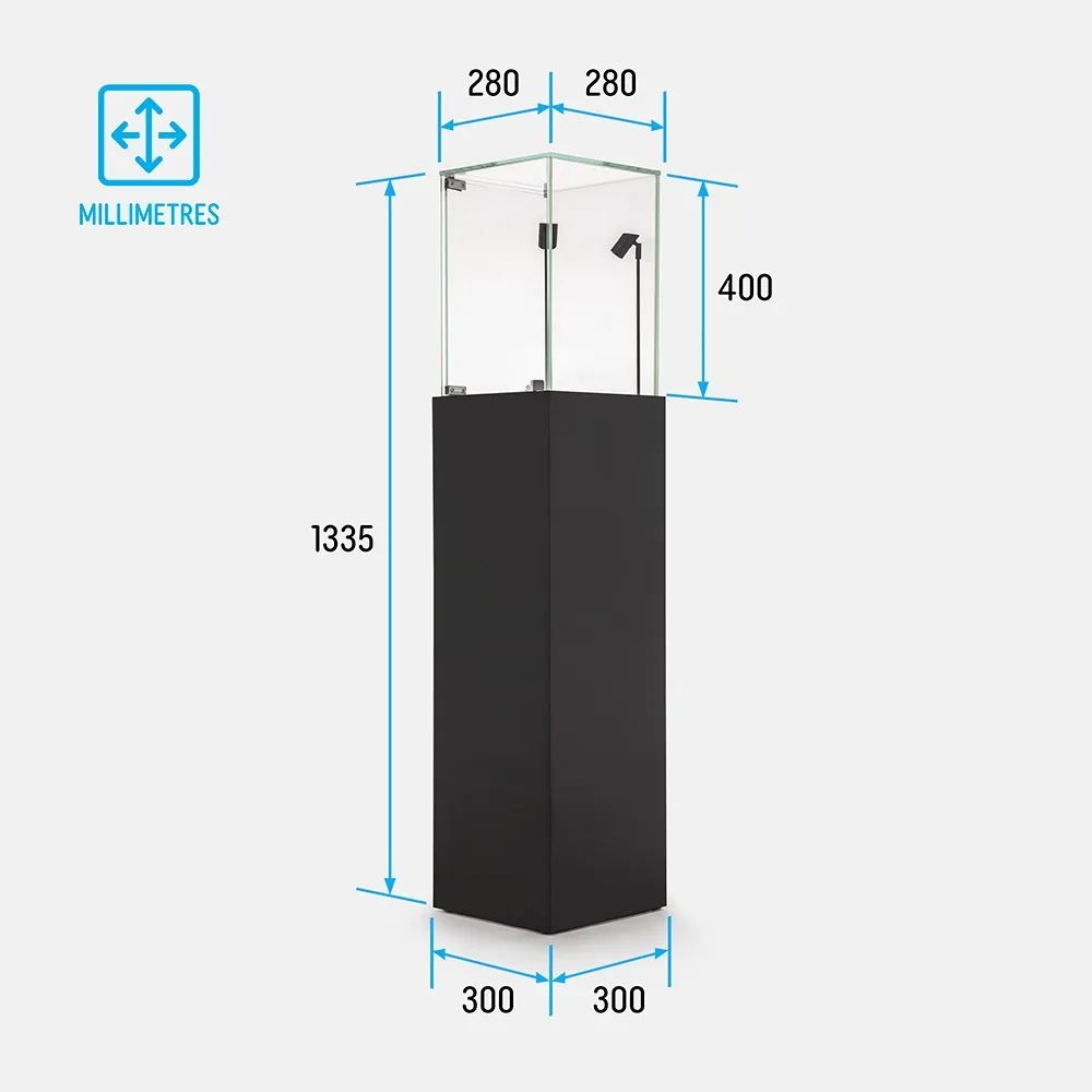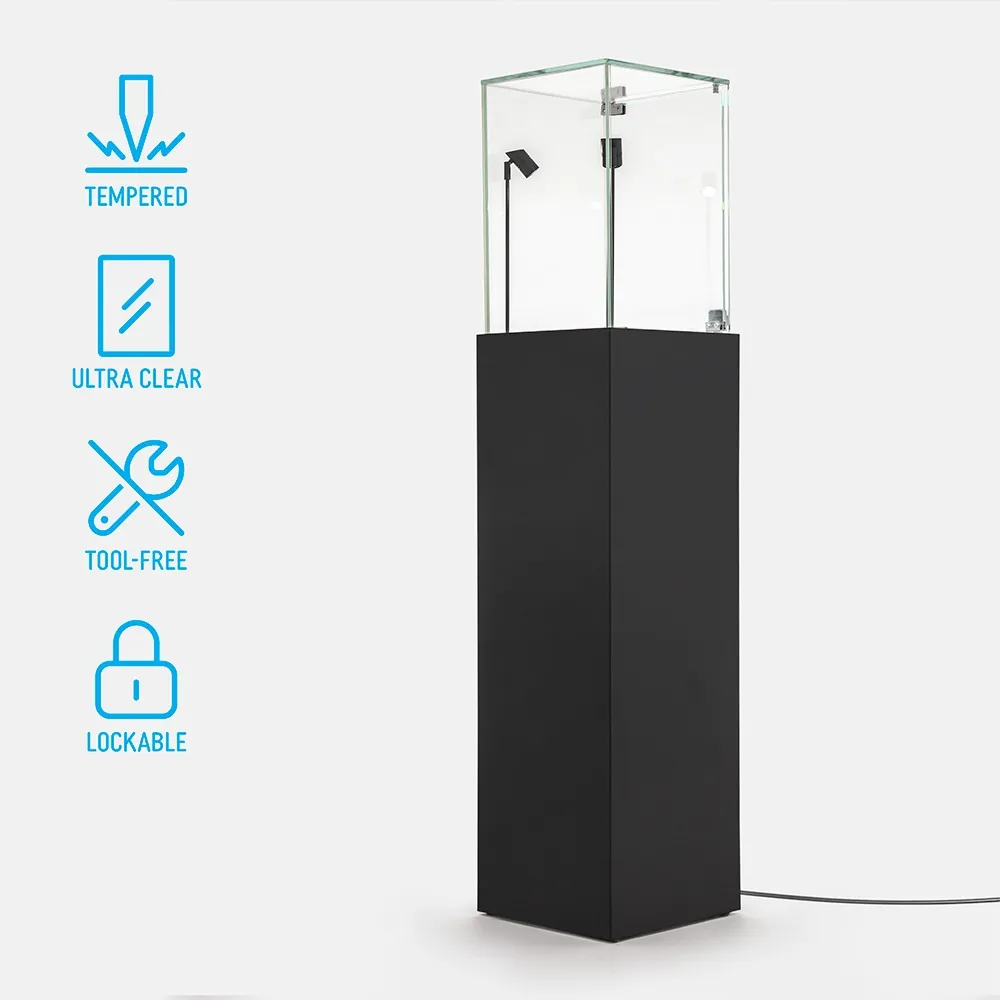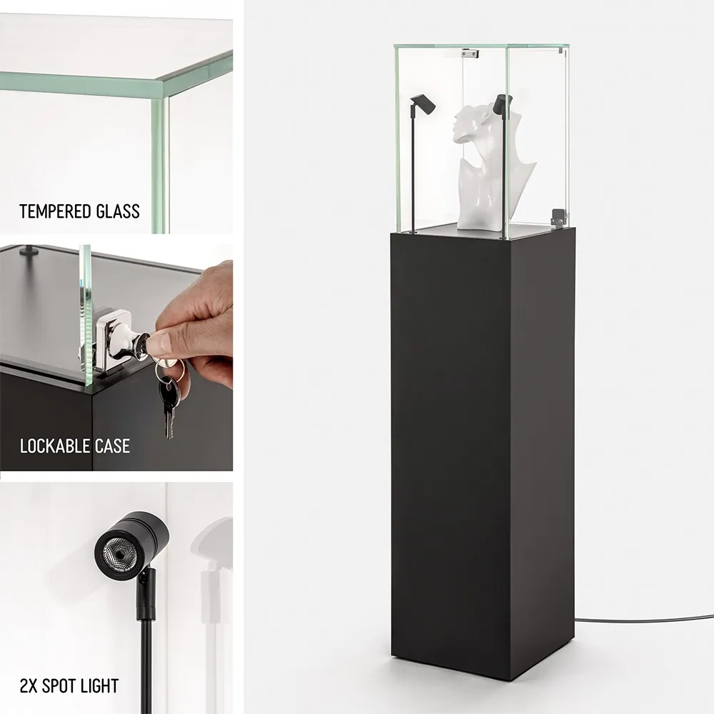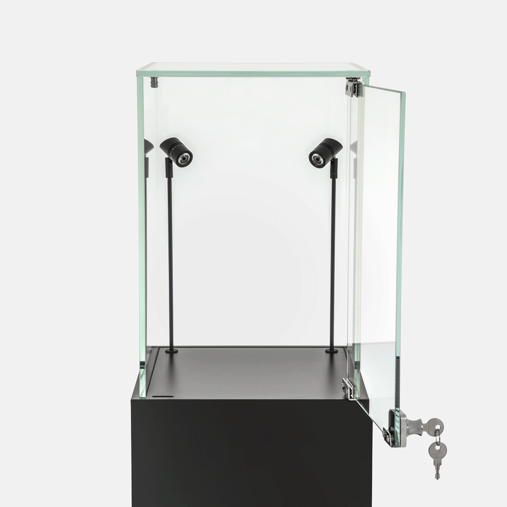 The illuminated display pedestal features a lockable hinged door to protect valuables from tampering or accidental contact. Its retail display plinth with lights suits hero products, collectibles and limited-edition releases. The lighted display plinth with glass top ensures customers can view items from all angles without compromising security.