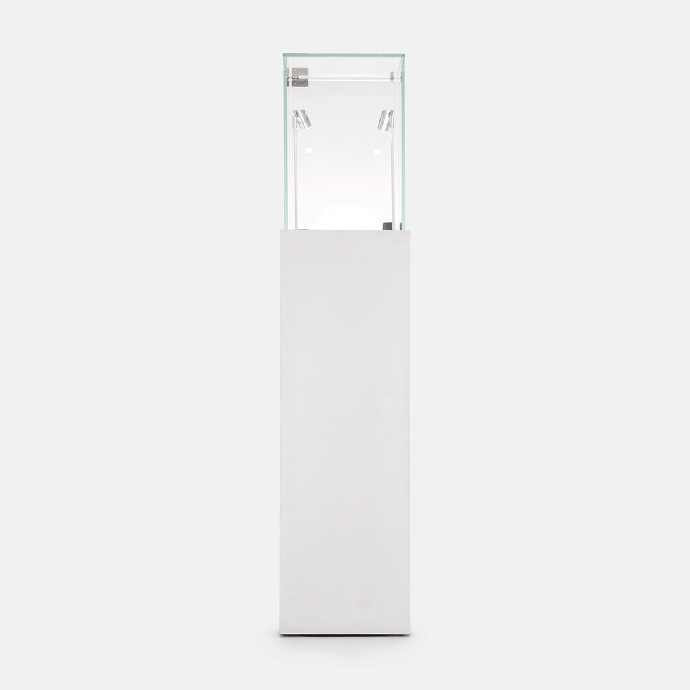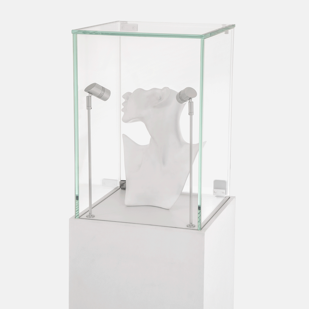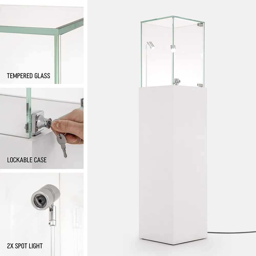 The gallery display pedestal with lights includes a lockable hinged door that maintains curatorial control and reduces handling risks during peak visitor hours. Its glass-top display pedestal with LED spotlights ensures reliable visibility for jewellery, awards and collectible pieces. A freestanding illuminated showcase also integrates well in boutique retail settings requiring museum-grade presentation standards.
