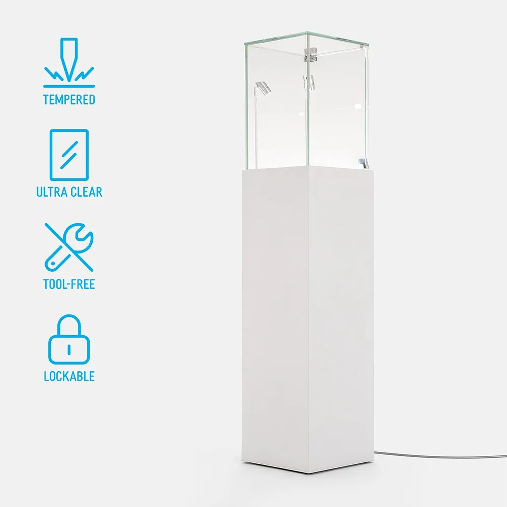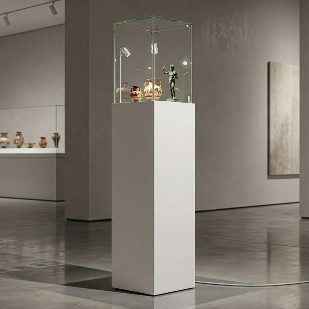 Glass display pedestal with lights systems offer museums, galleries and cultural venues a secure and high-clarity method for exhibiting artefacts, valuables and curated works. The frameless tempered glass top provides full viewing angles, while LED spotlights deliver consistent illumination in heritage spaces where ambient lighting can be uneven. This museum display pedestal with lights helps curators create controlled presentation zones for fragile or significant items in public exhibitions.