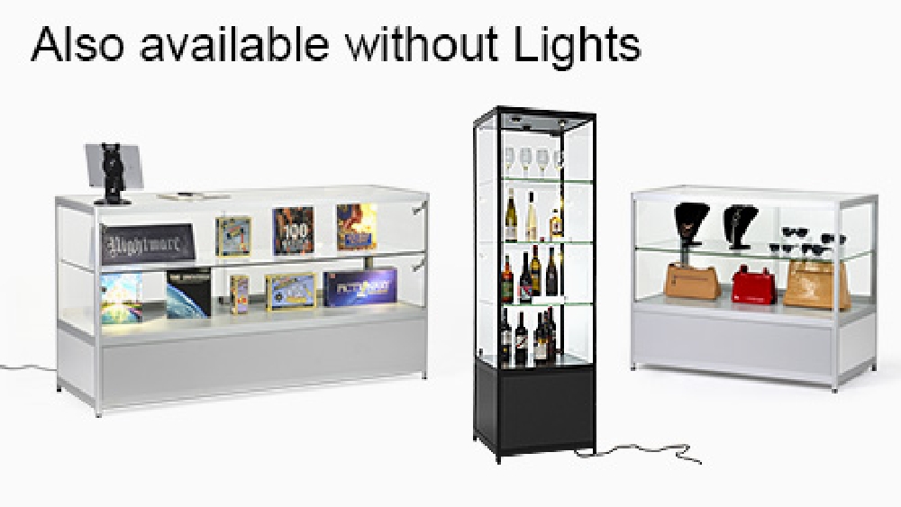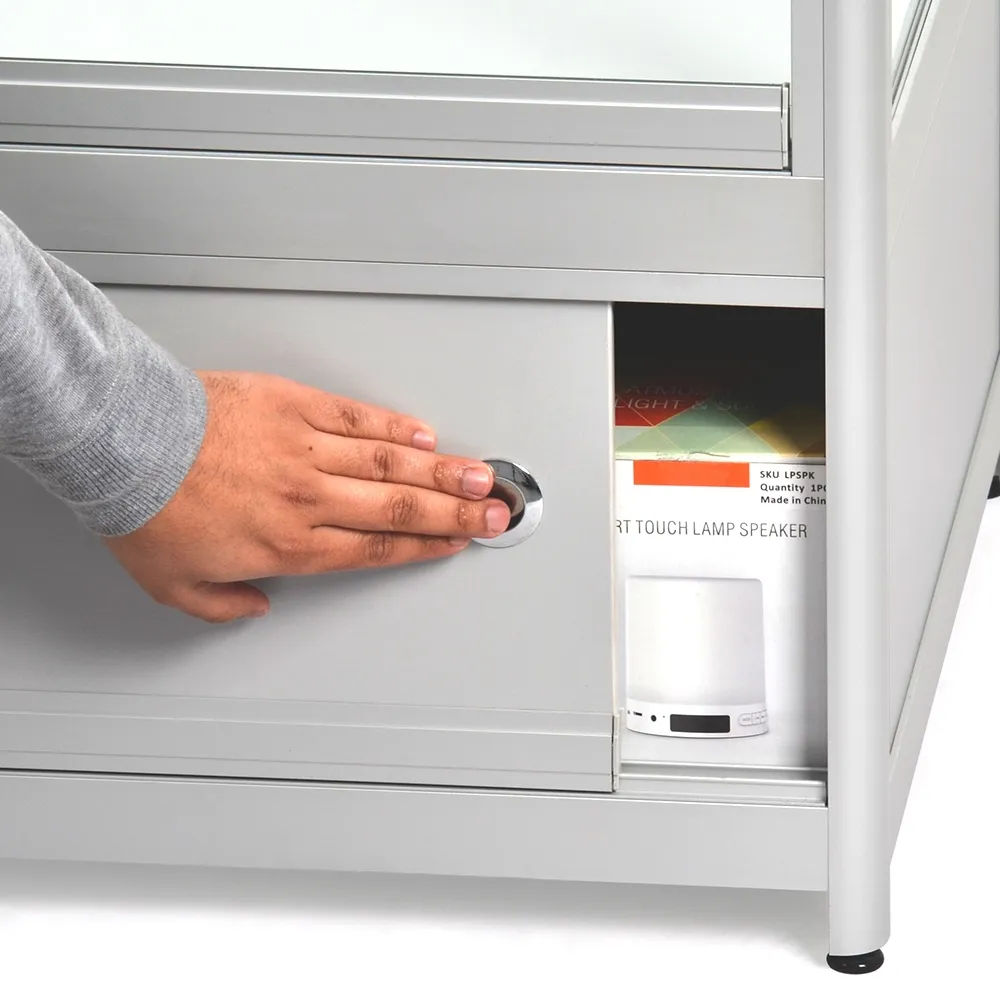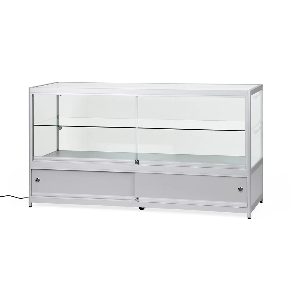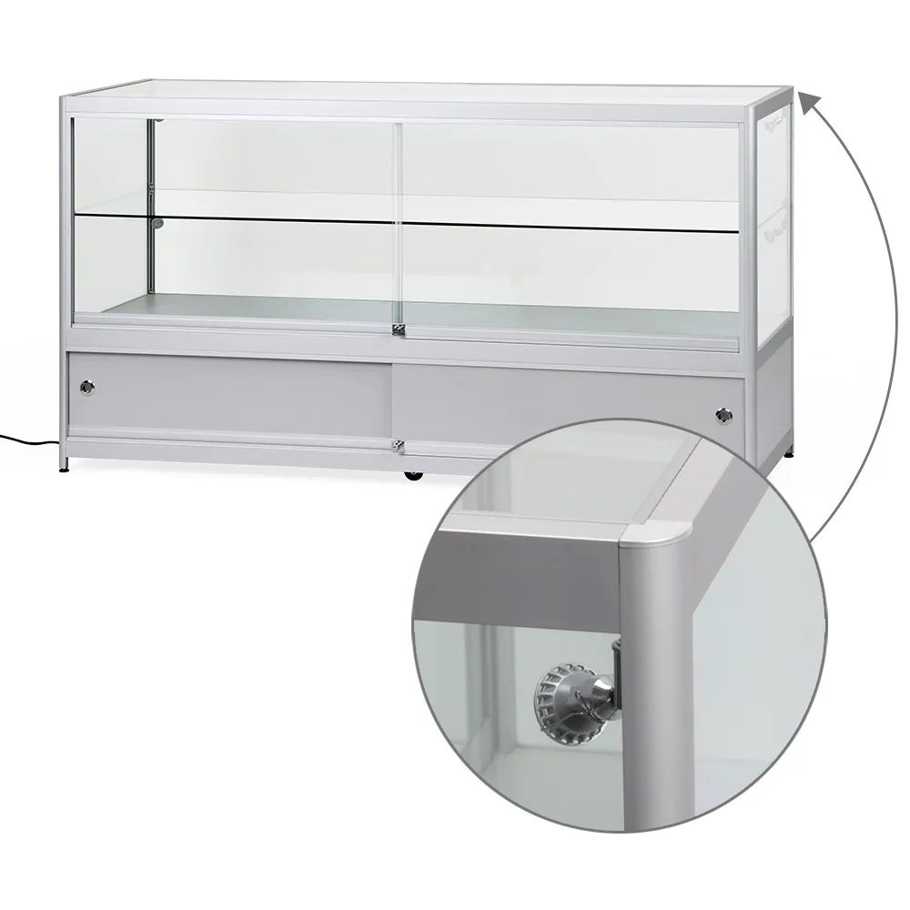 Aluminium display cabinets have a large 1750 x 550mm countertop with a 70kg max load perfect for placement of promotional signage, conducting transactions, or just to view on display items from above. The store fixtures have (4) 2.5 watt LED lights that can be angled to better highlight items within the case and draw attention to them. The glass retail showcase features locking sliding doors for both the upper display and the lower storage cabinet, securing items and helping to prevent theft. The lower storage area is large at 285 x 1780 x 570mm to hold overstock items, packaging of items put inside the case or personal items of employees to keep them out of sight.