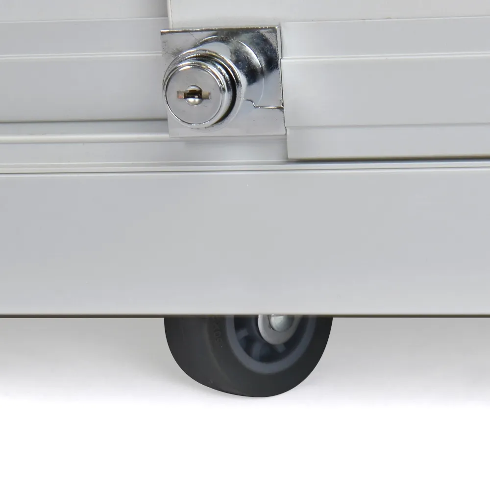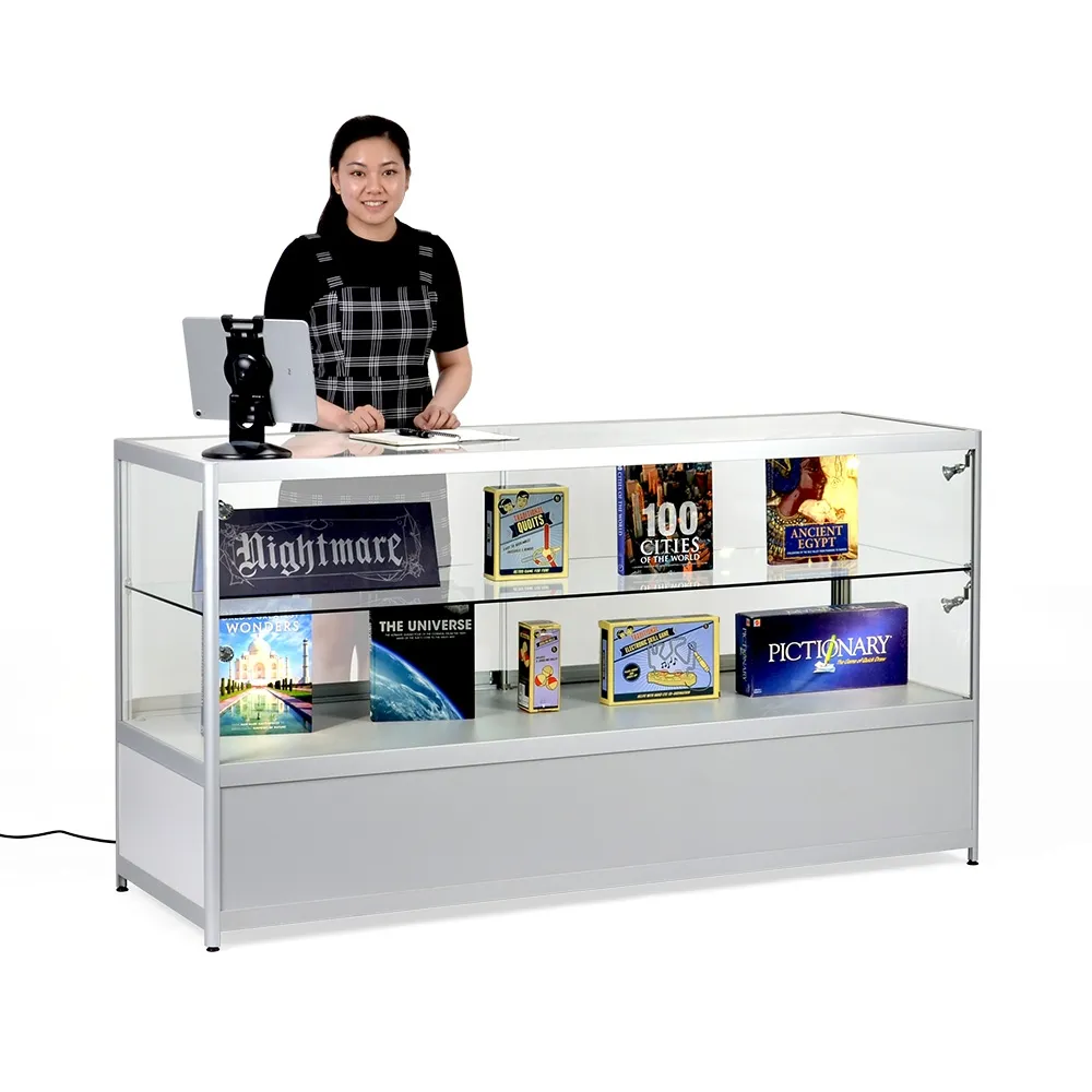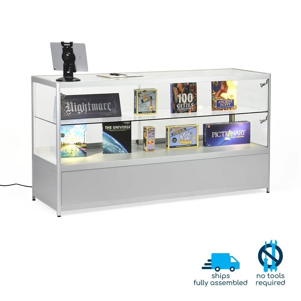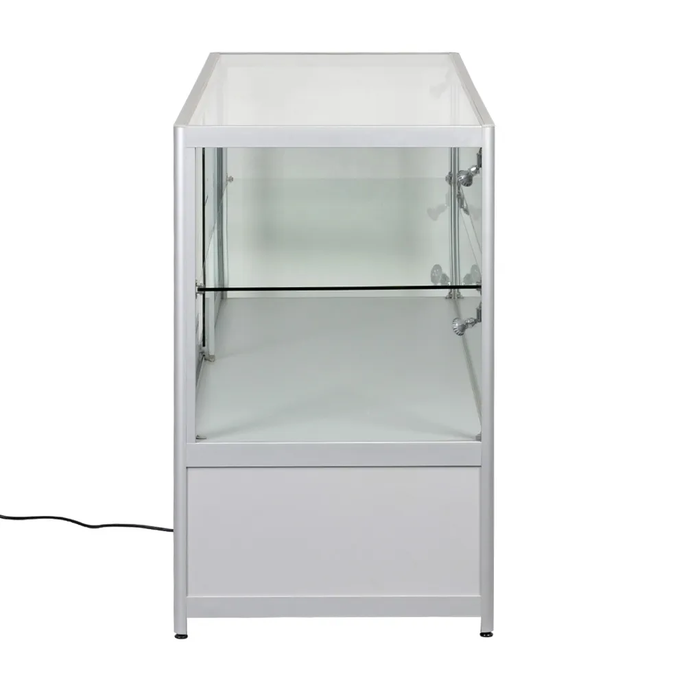 Aluminium display cabinets have a large 1750 x 550mm countertop with a 70kg max load perfect for placement of promotional signage, conducting transactions, or just to view on display items from above. The store fixtures have (4) 2.5 watt LED lights that can be angled to better highlight items within the case and draw attention to them. The glass retail showcase features locking sliding doors for both the upper display and the lower storage cabinet, securing items and helping to prevent theft. The lower storage area is large at 285 x 1780 x 570mm to hold overstock items, packaging of items put inside the case or personal items of employees to keep them out of sight.
