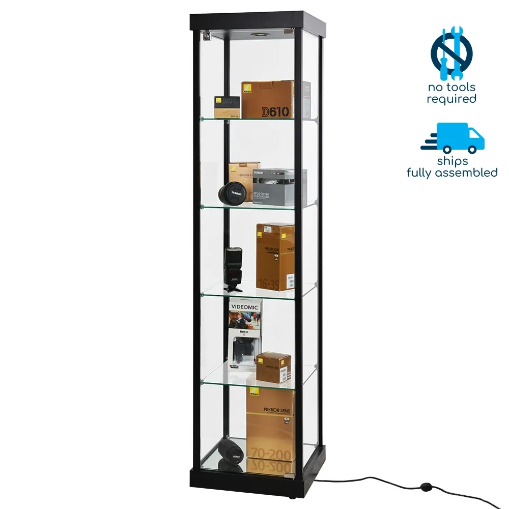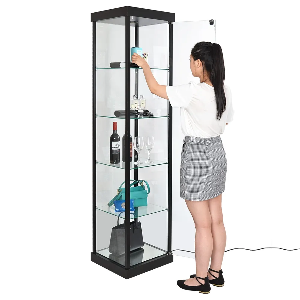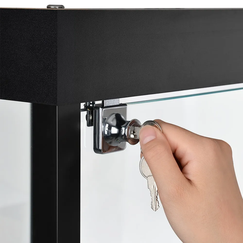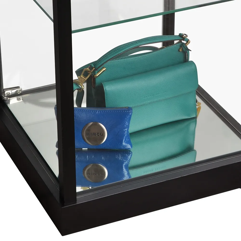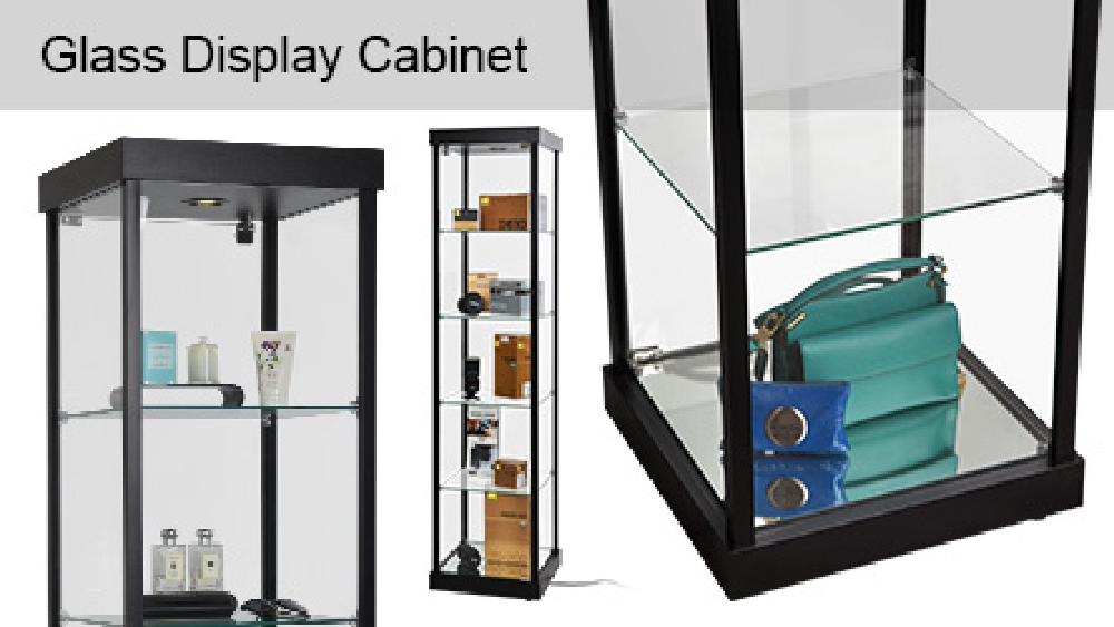 The glass display cabinets, part of our line of retail showcase, has (5) levels for placing your items on display. There are (4) 7mm thick tempered glass shelves with green tinted edges for a truly upscale look, each at 395 x 395 mm and able to hold items up to 350mm tall. The lowest level and accents around the top and bottom are made from black laminated MDF, with the main frame constructed of durable aluminium.