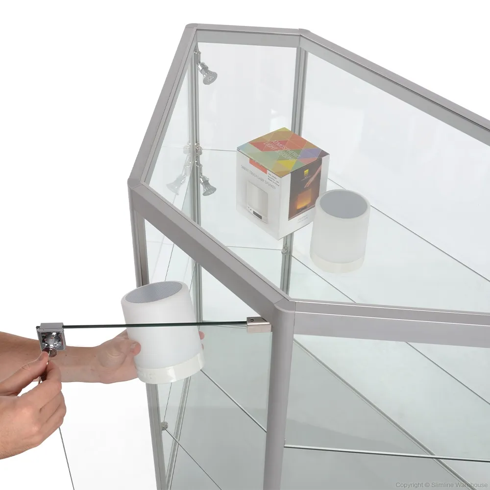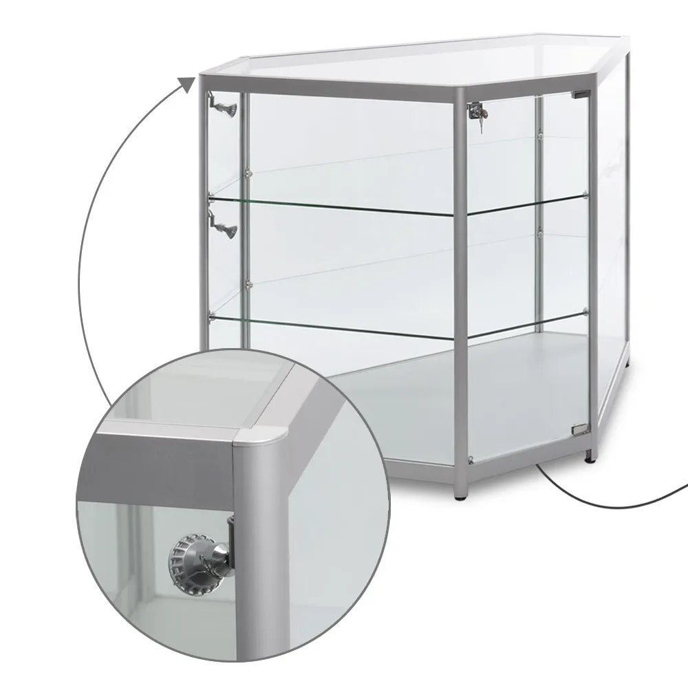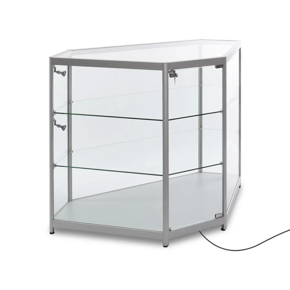 The corner glass showcase, like lighted store fixtures, features LEDs inside the case to illuminate displayed items and help to capture customer's attention. There are (4) adjustable 2.5 watt lights that can highlight specific items on the upper two tiers, powered by a 2m cord that easily reaches to power outlets. Two tempered glass shelves create the different levels within the case, with each tier offering 1120 x 560mm of space to hold items up to 285mm tall, with a total weight of 40kg on each glass tier. The clear glass top supports up to 70kg on the 11350 x 555mm area, making it easy to have customer interactions and hold various promotional displays.
