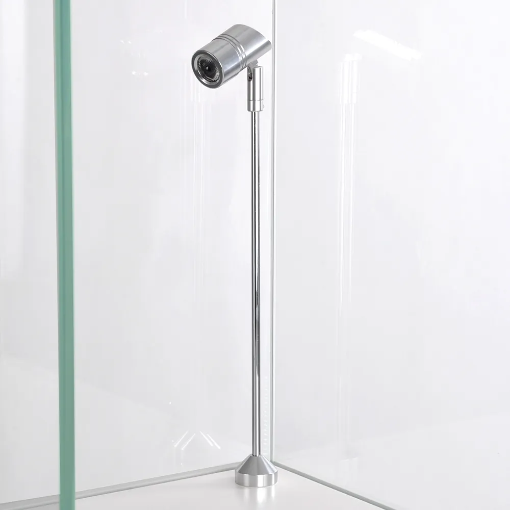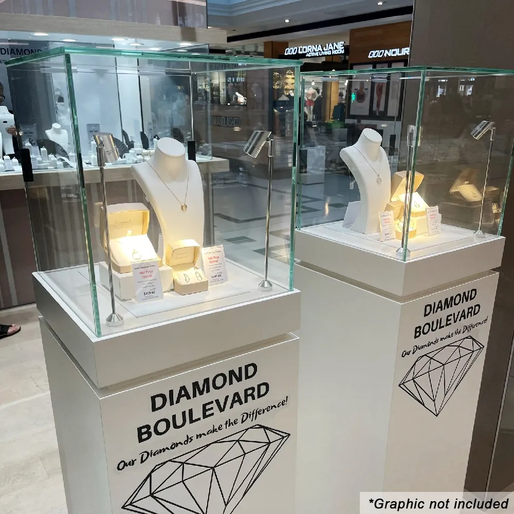 The lighted display pedestal, great for use as retail fixtures, is 1620mm tall to be easily seen and call attention towards the centre case, with a 400 x 400mm footprint taking up little space on showroom floor. This illuminated showcase has (2) 700ma LED lights that are adjustable for easy positioning to best highlight on display items. A 2.2mm power cord is provided to reach nearby outlets with ease. The interior of the case is accessed by unlocking the storage drawer and sliding it and a single pane of glass out. This locking drawer offers 305 x 22 x 44mm of storage space, great for holding smaller items and boxes of jewelry put on display.