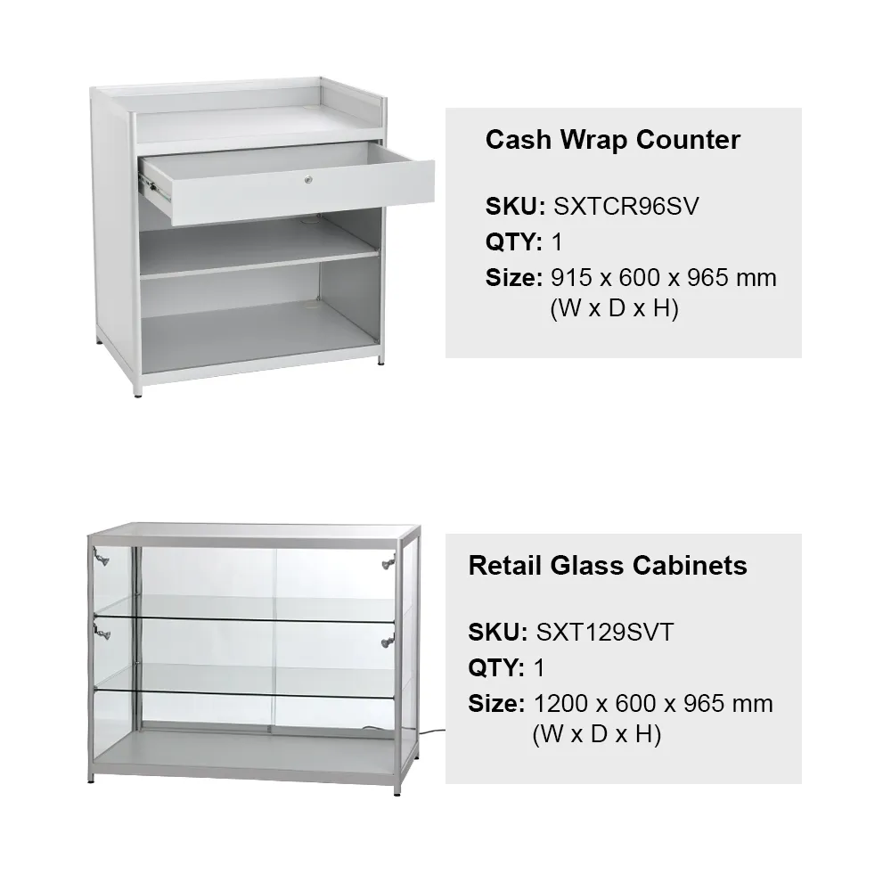 • Includes 120 x 60cm showcases & 915 x 60cm cashwrap stand