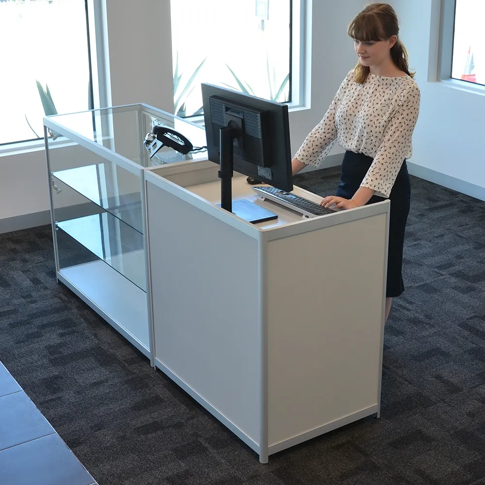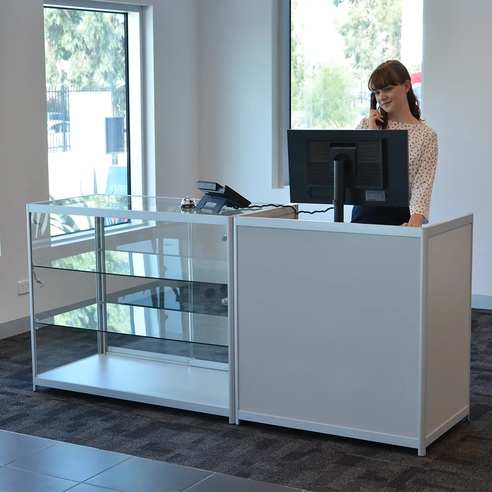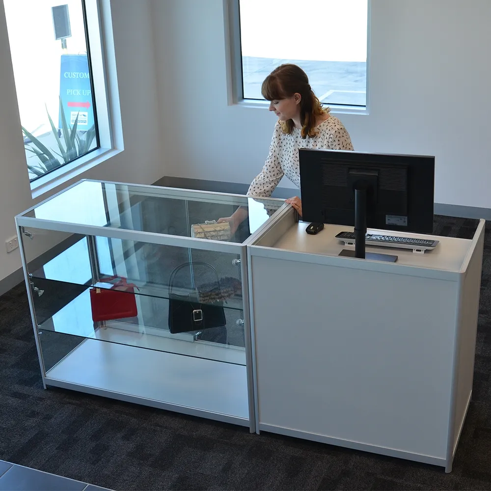 This cash register desk is a 2 piece modular display, with a full vision display case and cashwrap stand combining to create a checkout stand for any business! The sales counters has a 1200 x 600 x 965mm showcase with locking sliding doors that secure items placed inside, making it ideal for shopping centres, jewelry stores, retail shops, and high end electronic or camera shops. The full vision design of the glass showcase has a clear countertop for views from above, with the durable tempered glass strong enough to hold promotional signage, conduct transactions and more.
