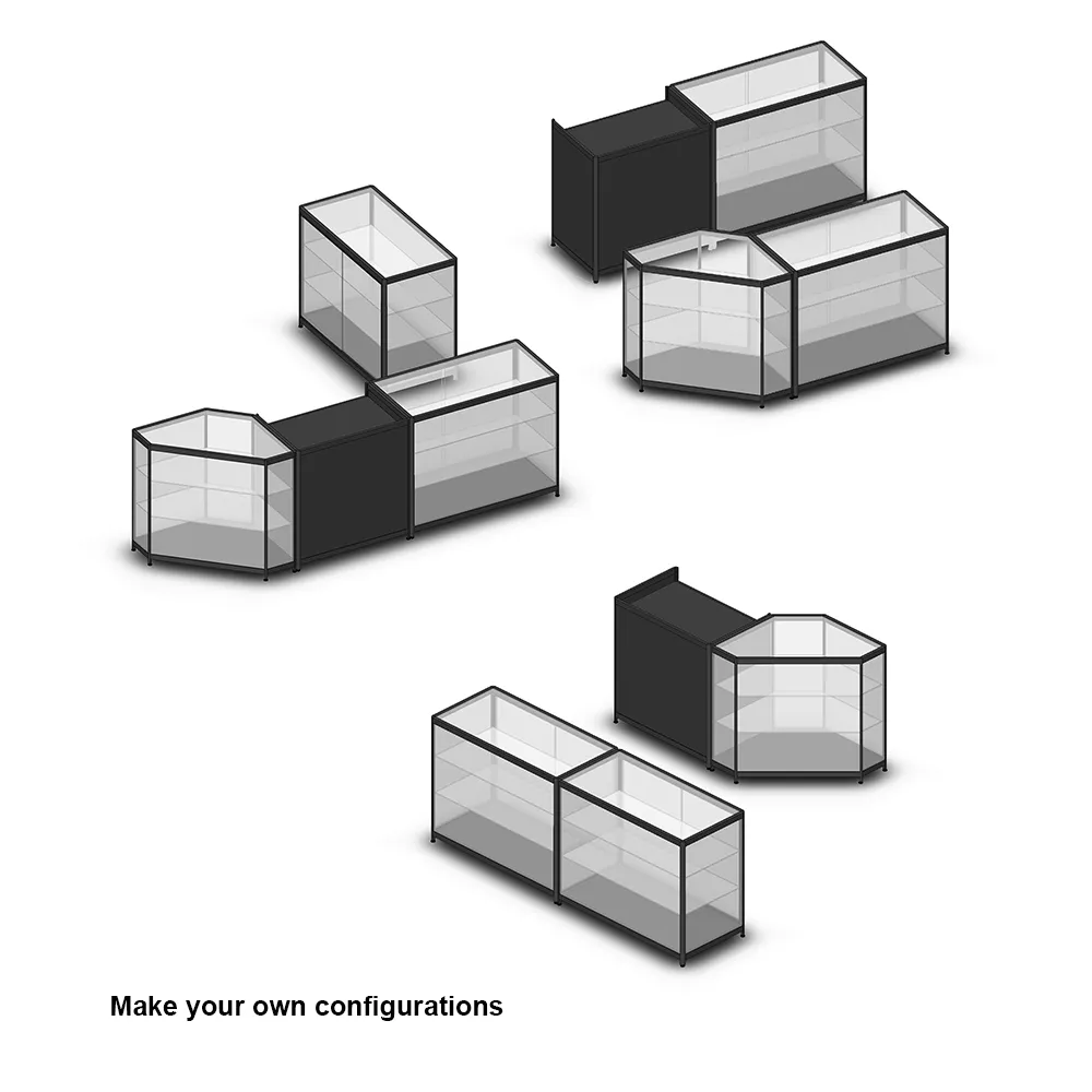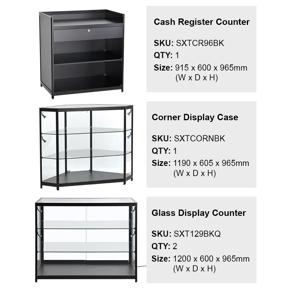 • Includes: (2) 120cm showcases, (1) corner unit, (1) 915cm wide register stand