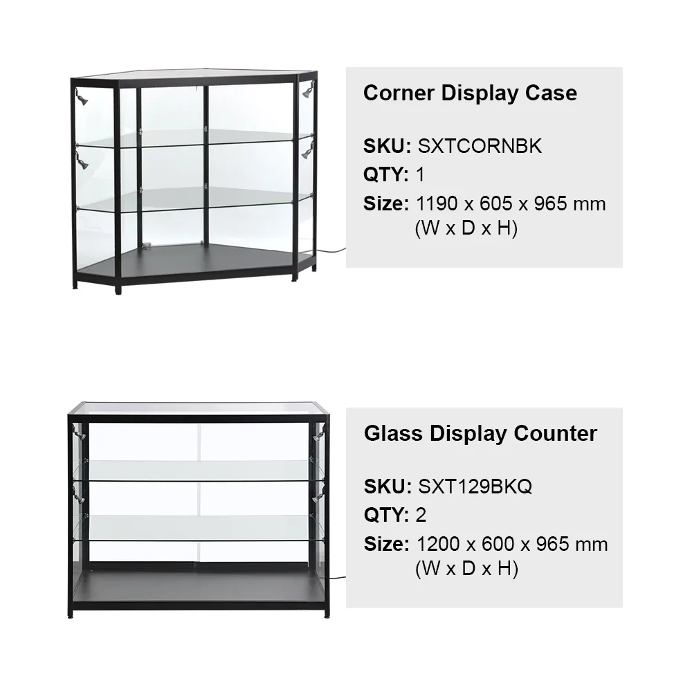 - Includes: (2) 1200 x 600 x 965mm showcases & (1) 1190 x 605 x 965mm corner unit