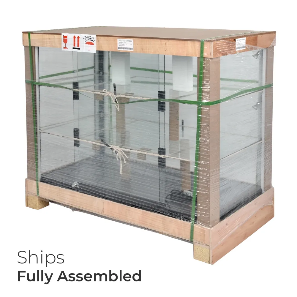 No assembly is needed for these showcases, as they ship fully set-up to be ready to go out of the box to save you time trying to follow complicated instructions to connect all components together. The retail display cabinets have aluminium framing in a black finish for a stylish look that works well with any décor. The base is made from thick laminated MDF to support ample weight, with the same black finish to complement the minimal framing. Each leg has an adjustable foot to level out the cabinets on uneven surfaces. Slimline Warehouse ships fast to anywhere in Australia, buy online today!