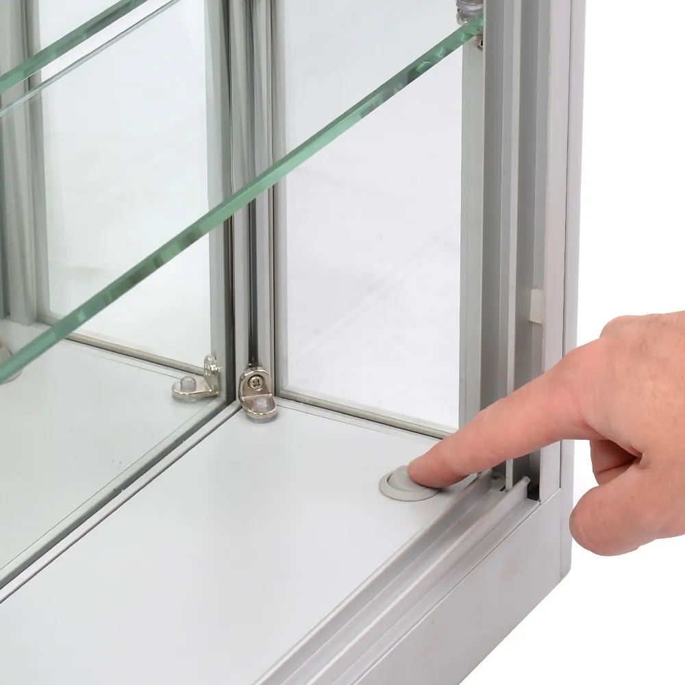 • Silver aluminium frame with 7mm thick clear glass shelves, doors, & sides