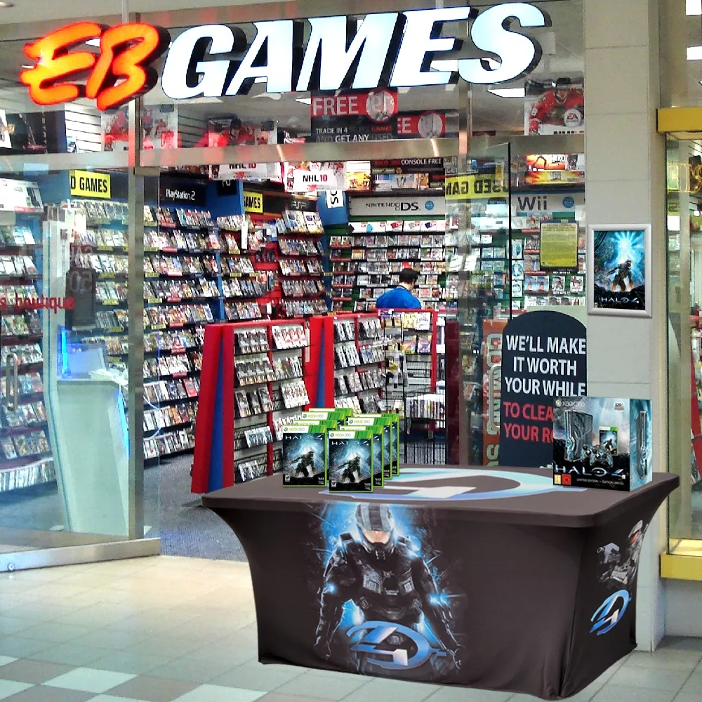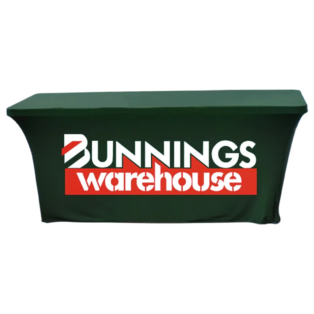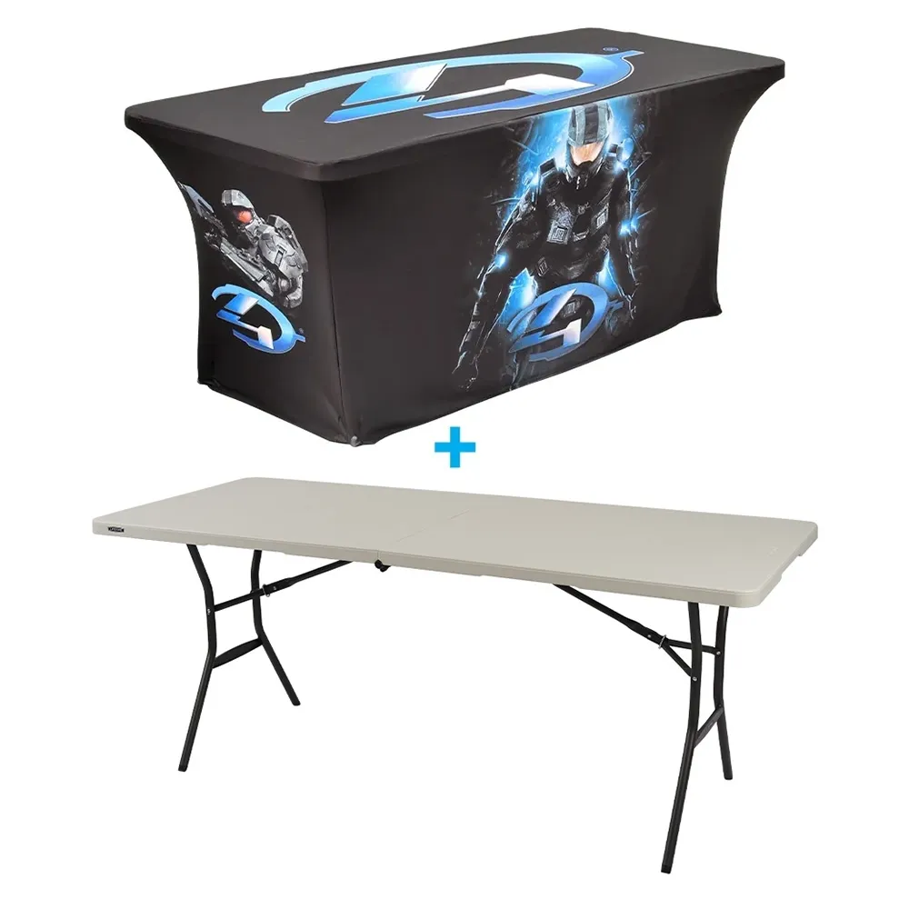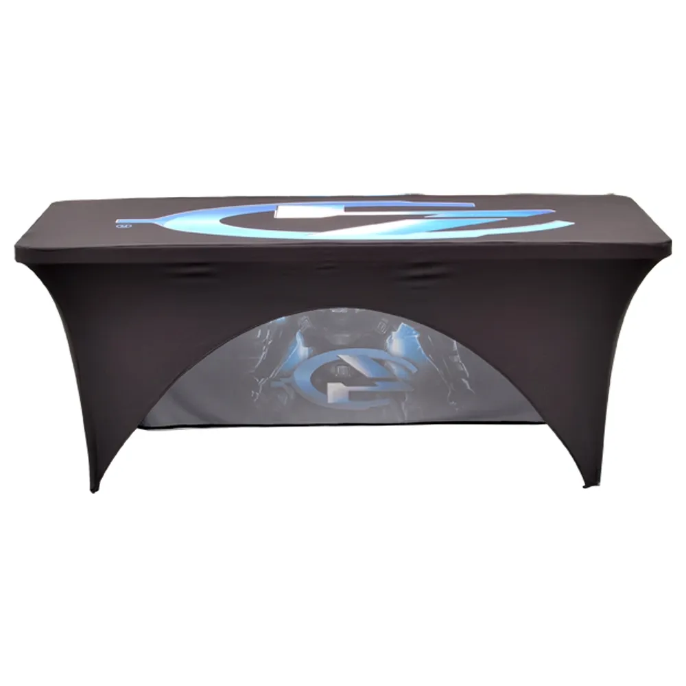 Fitted tablecloths are a great way to display your branding at events to get passersby interested! The stretch fabric throw has your custom designs digitally printed in full colour using a dye-sublimation process that easily draws attention thanks to rich colours and vivid imagery. Printing is done on the entire throw, and our in house team is available for design assistance if needed. There are three options to choose from, allowing you to pick the amount of help that best suits the needs of your location. The stretch wrap is made from machine washable polyester to be easily cleaned between uses and is fire retardant for safety. This style of throw is great for retail stores, exhibition halls, career fairs, trade shows, universities, and more!