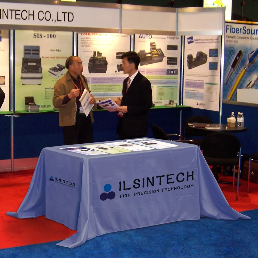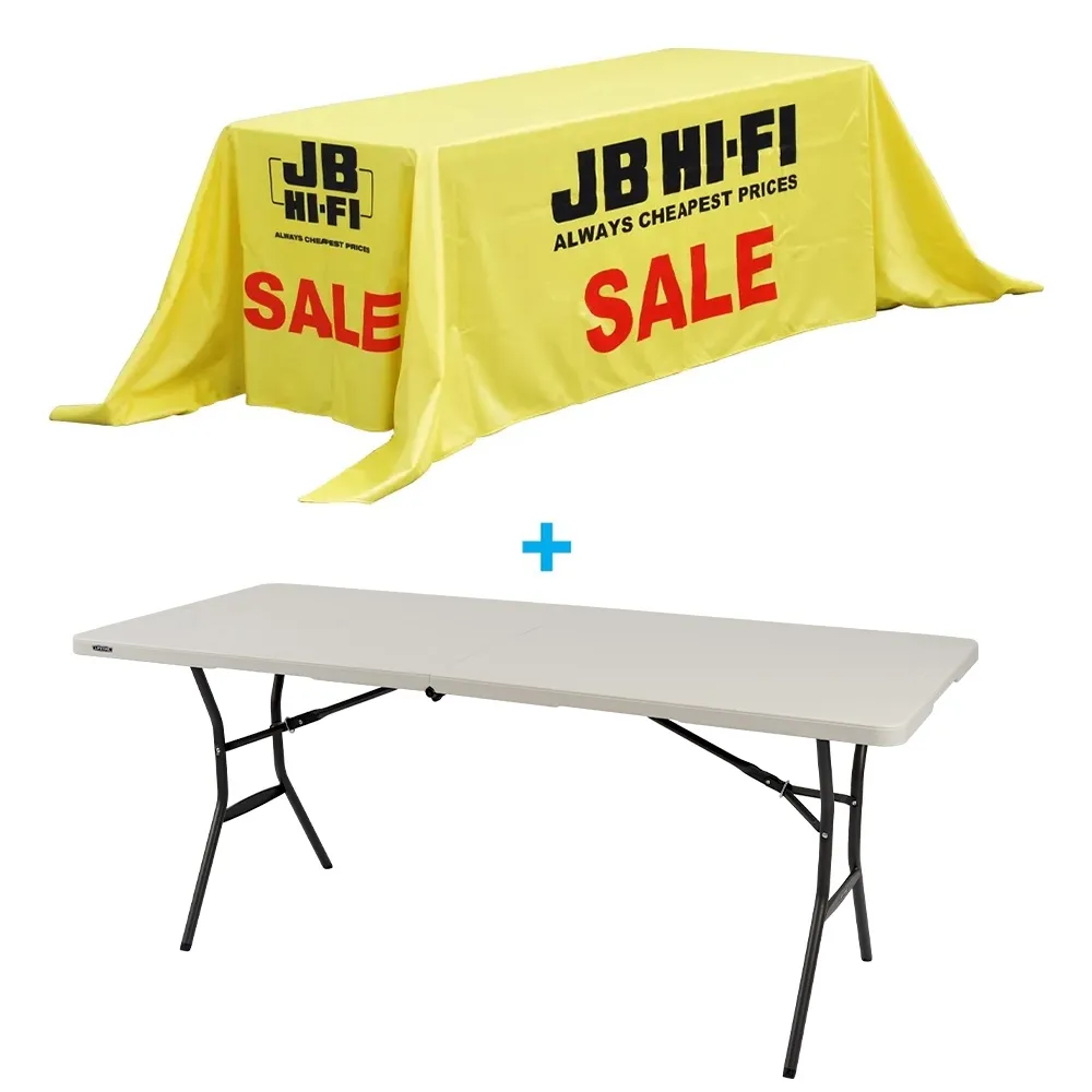 These trade show table drapes are a great way to offer a branded presentation setup at universities, exhibitions, trade shows, retail stores, shopping centres, and more! This kit includes a custom printed tablecloth with your branding and designs on all four sides for an all encompassing display! Designs are digitally printed in full colour using a dye-sublimation process that results in rich imagery and vivid colours that is sure to draw attention and get passersby interested. If you need design help, our in-house expert team is available, offering three tiers of assistance to provide the right amount of help for your needs. The tablecloth is made from polyester that is machine washable for easy cleaning and fire retardant for safe use in any venue.