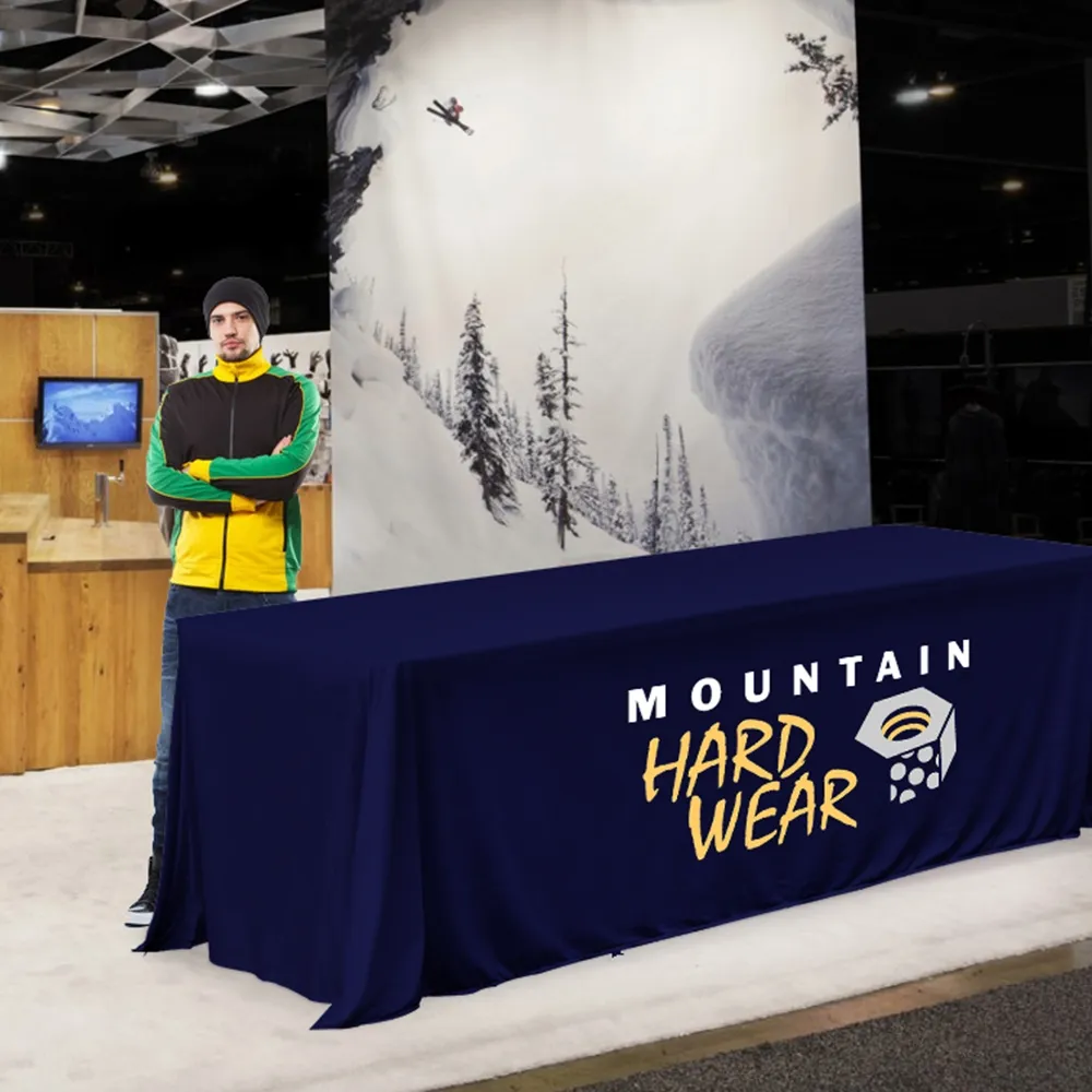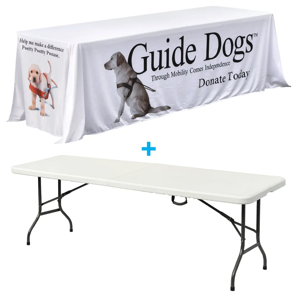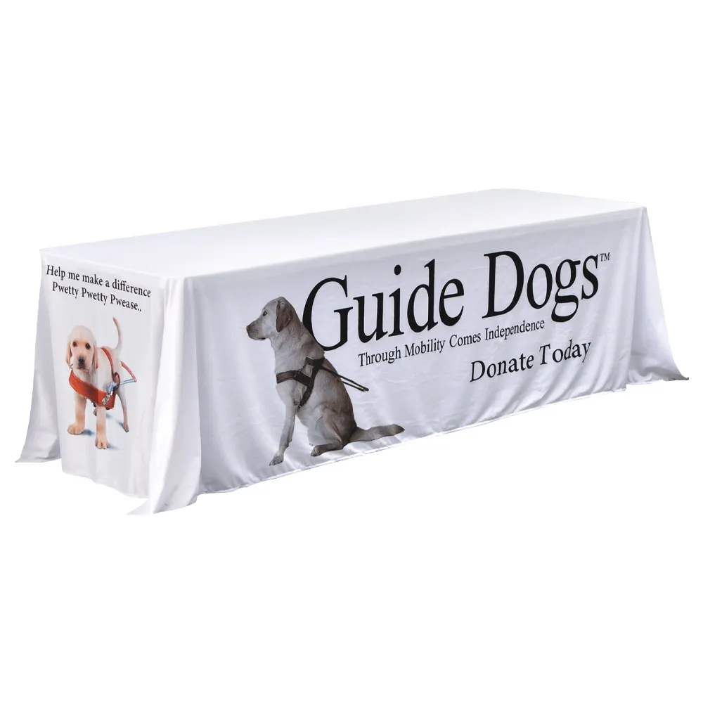 - Custom printed table skirt kit includes an 8 ft. table & a full cover table throw