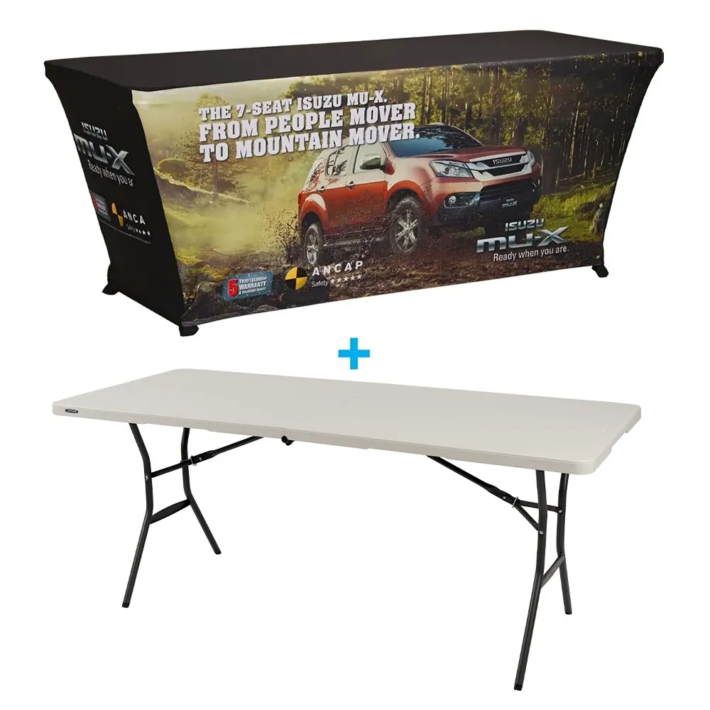 A trade show table cloth, like many custom print table coverings, covers four sides of the table to allow use against a wall or in the middle of the room. By having all sides covered, you are able to store flyers, product, additional merchandise and personal items underneath the table out of view of passersby no matter where you set-up! There is a 6 ft folding table included with this kit as well that is made from hard HDPE plastic to be long-lasting in all environments. The table is 1829 x 762 x 737mm when set-up, and can fold down to only 80mm for easy storage when not in use. A built-in handle makes carrying the 11.1kg table into position easy as well. Slimline Warehouse has fast shipping to anywhere in Australia, buy online today for quick dispatch to Melbourne, Sydney, Canberra, Adelaide, Perth, Brisbane, Wollongong, Gold Coast, Hobart, and anywhere else nationwide!
