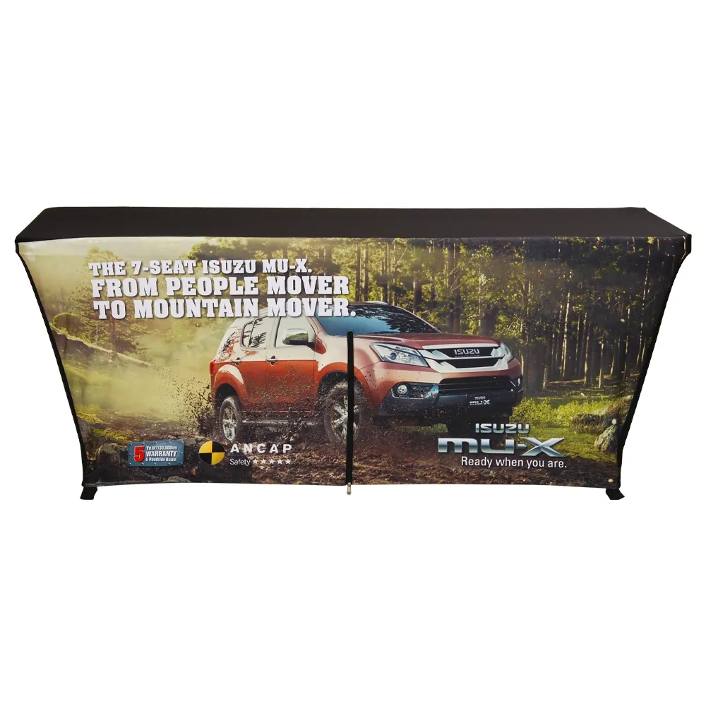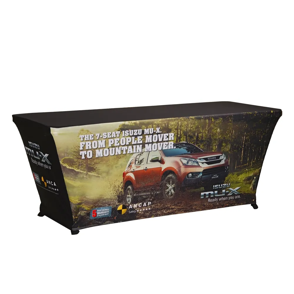 This trade show table cloth includes a portable table for an all-in-one kit that is perfect for exhibitions, universities, retail stores, shopping centres, and any event. This table covering features your custom designs digitally printed in full colour, offering an eye-catching depiction of your graphics to really draw the attention of passersby and get them interested in your business. A dye-sublimation process is used to provide rich colours and vivid imagery that don't fade over time to last for years to come, with printing down all over the entire wrap. Our in-house team is available for design assistance as well, offering three tiers of support to help your complete the tablecloth to your exact needs. The table throw is made from stretch polyester fabric that can be washed in a machine for easy cleaning in between events and is also flame retardant for added safety.