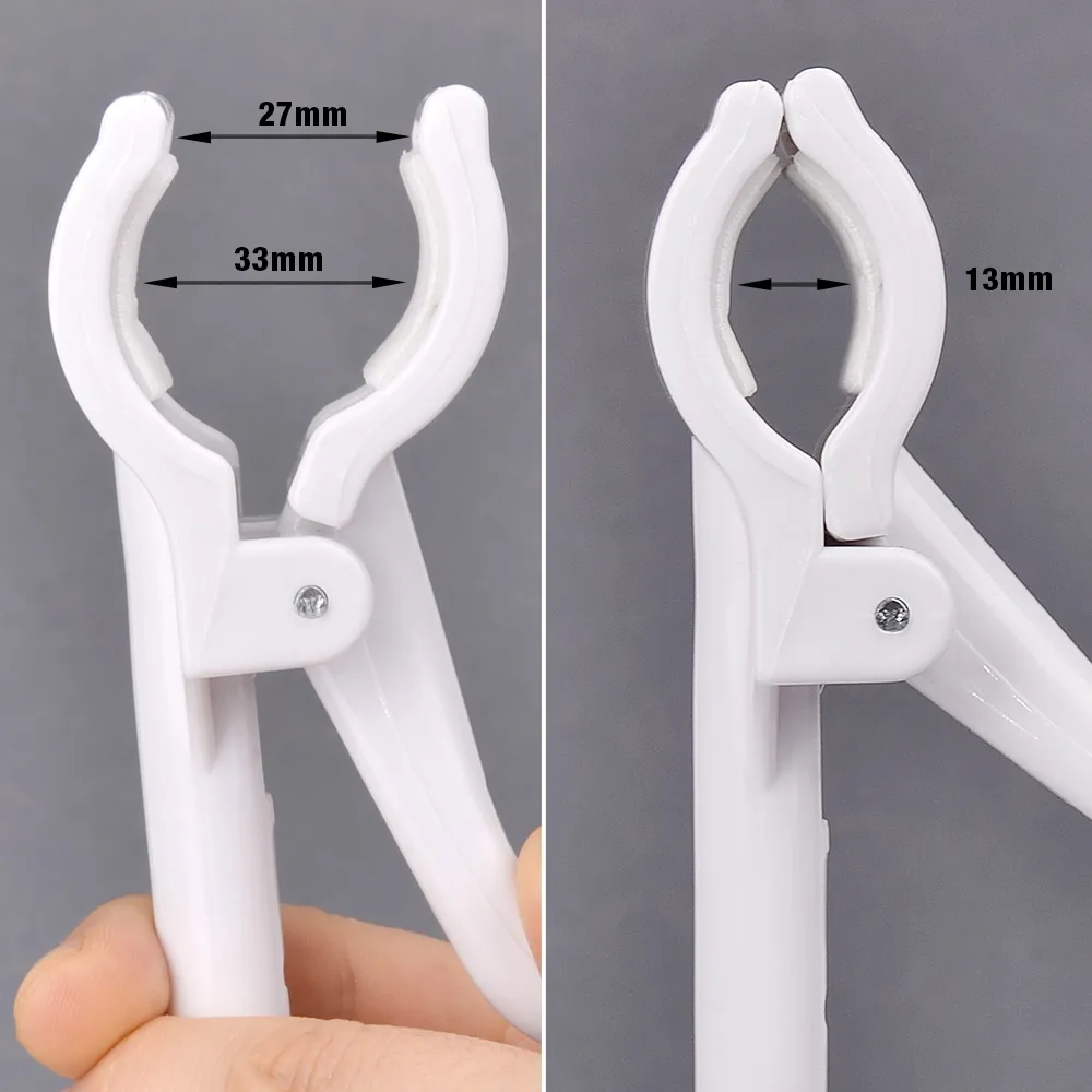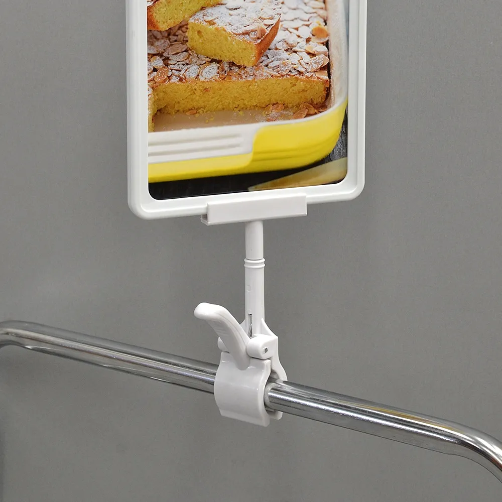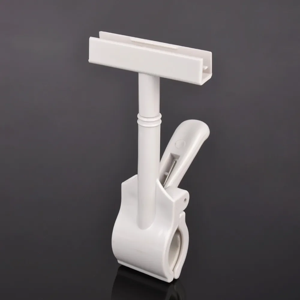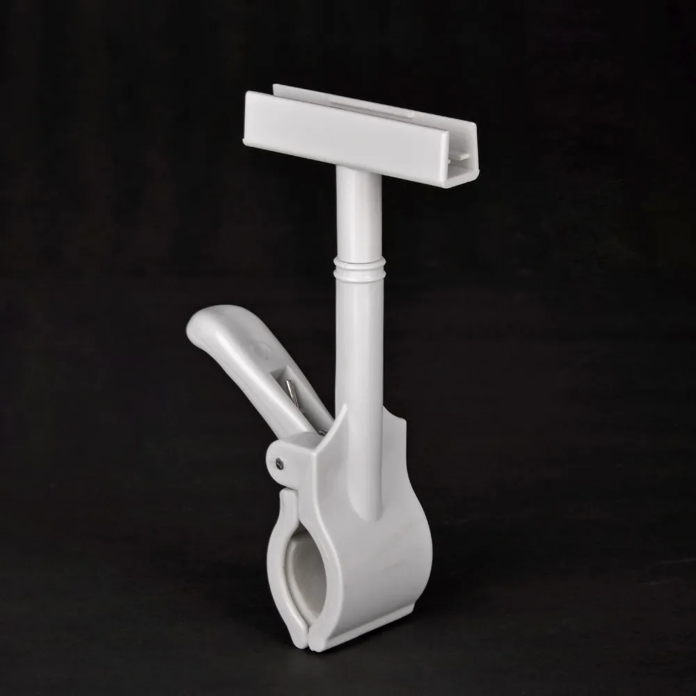 This price label holder is designed to hold POS frames that are up to 10mm thick within the channel atop the clamp. The plastic store signage uses a rotating head to make positioning signage for easy viewing simple no matter how you have to attach the clamp. The white plastic design provides an aesthetically pleasing display that matches any décor.