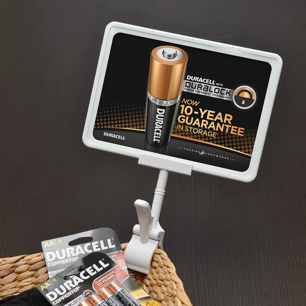 This price label holder, like a retail sign display and wholesale store fixtures, is a low cost display made of durable plastic to ensure long-lasting use in heavily trafficked locations. The sign gripper features a versatile clamp that attaches to both round & flat surfaces with ease. Rubber lining on the interior of the clamp ensure the display stays in position once in place.