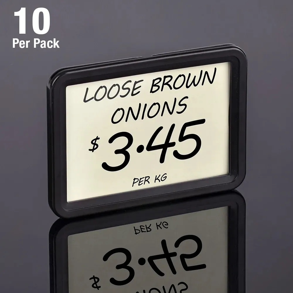 These A7 black pricing signs have slots on the back to attach to different holders that feature a tab, including our range of shelf holders. The frame is only 9mm thick as well, to easily be held by sign grippers, plastic feet, aisle invaders, and magnetic feet. Each purchase includes 10 pieces in the pack to help outfit your retail store, cafe, bakery, newsagency, grocery store, or any other location! Shipped from our Melbourne warehouse, order before 2 PM AEST to receive same day despatch to anywhere in Australia!