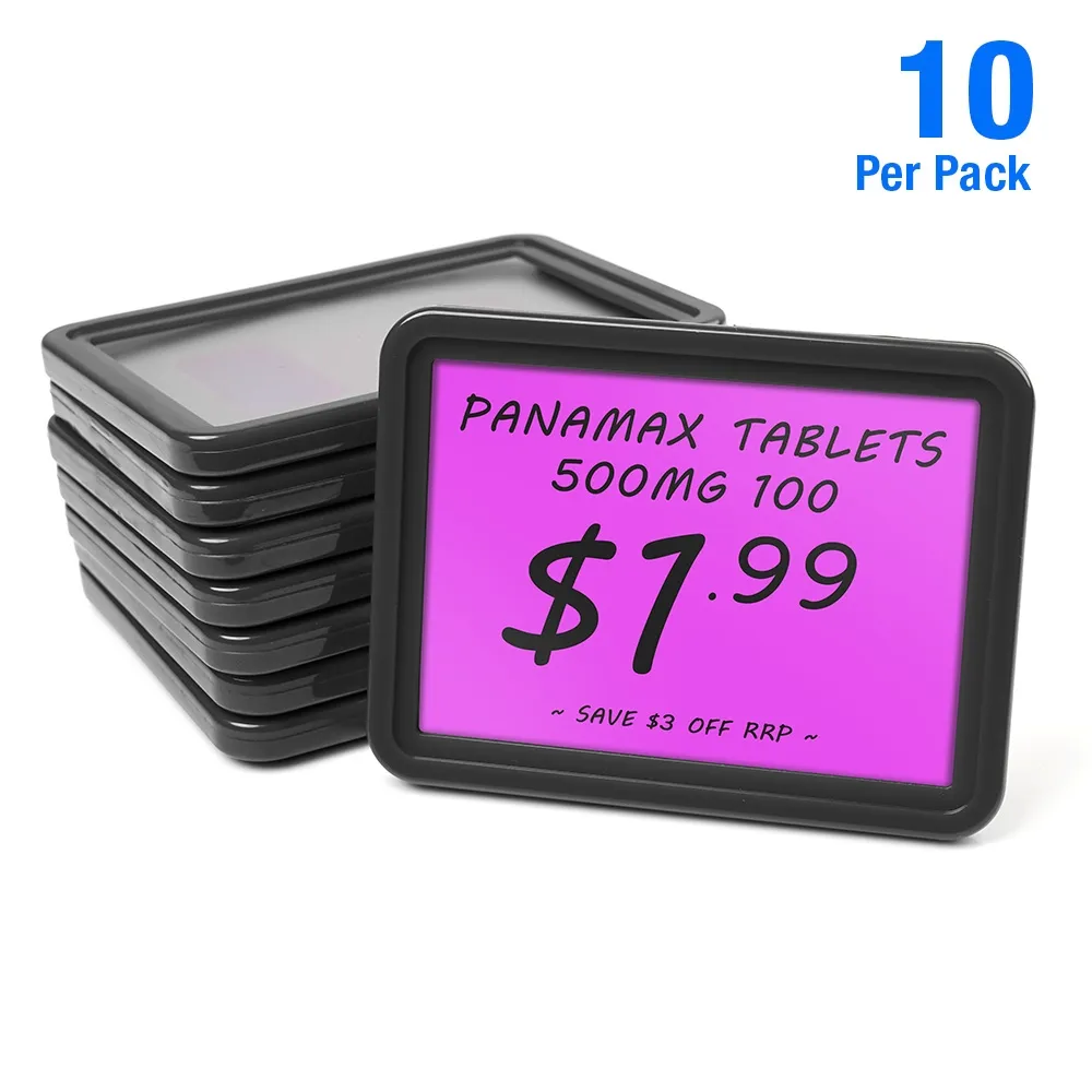 A7 black pricing sign to help your business effectively communicate information such as sale prices, product specifications, and ongoing sales to customers. The retail display consists of 10 (74 x 105mm) frames that display your custom-designed graphics in landscape orientation. This frame uses a simple slide-in design to make graphic changes fast and simple without any specialised tools necessary. Graphics are protected during use using a matte lens that also makes it easier to read in different lighting. This pricing signage is made from durable plastic, offering a low-cost display that stands up to the rigours of daily use in heavily trafficked locations for years to come.