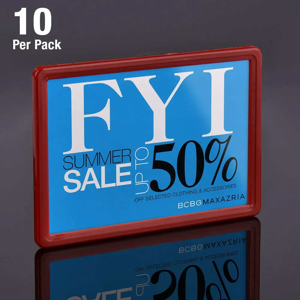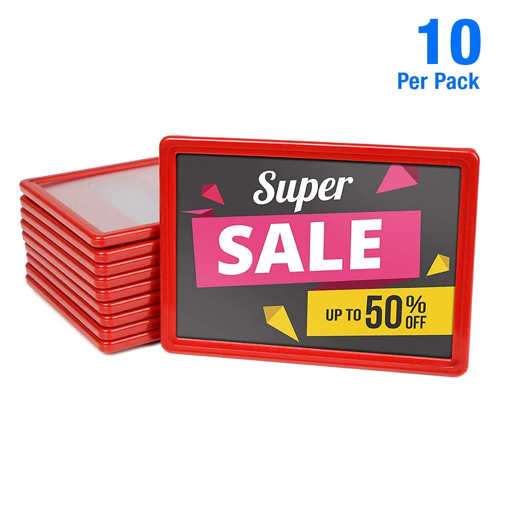 The red landscape price sign comes in a pack of 10 A6 frames. These fit 105 x 148mm graphics in a landscape format. Perfect for displaying pricing, product information, promotions or any other marketing materials around your store. The back of the frame features multiple slots that can be used to connect to hooks, grips and other holders. This lightweight frame is durable and inexpensive, making it a great instore marketing staple.