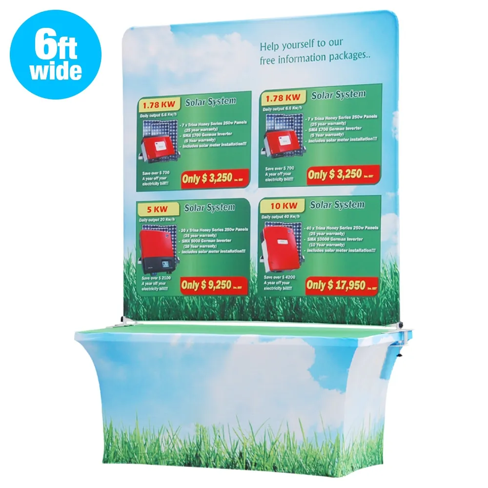 This exhibition display system features a 6 ft. table throw that has your custom designed graphics printed on it. Perfect for showing a company name or having information about your location and phone numbers to be reached at, the portable trade show display is digitally printed using a dye sublimation process that ensures an accurate representation of your designs.