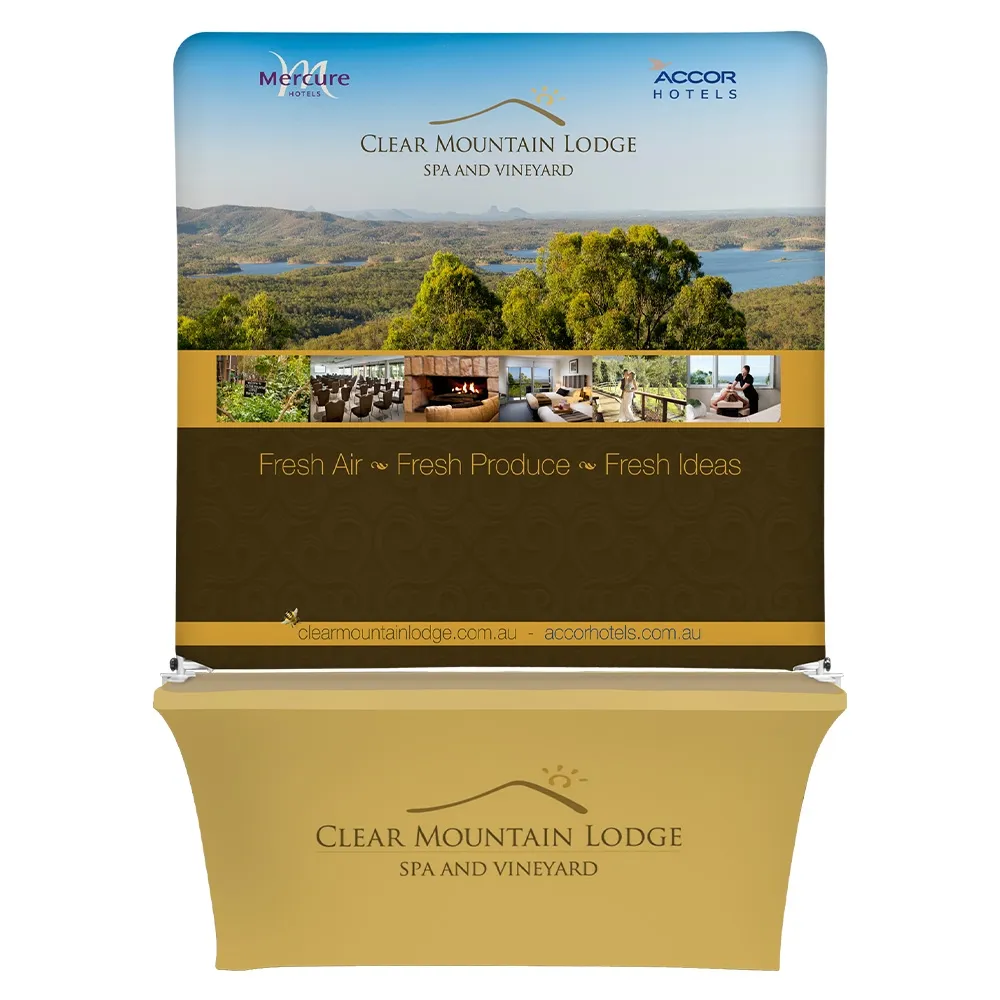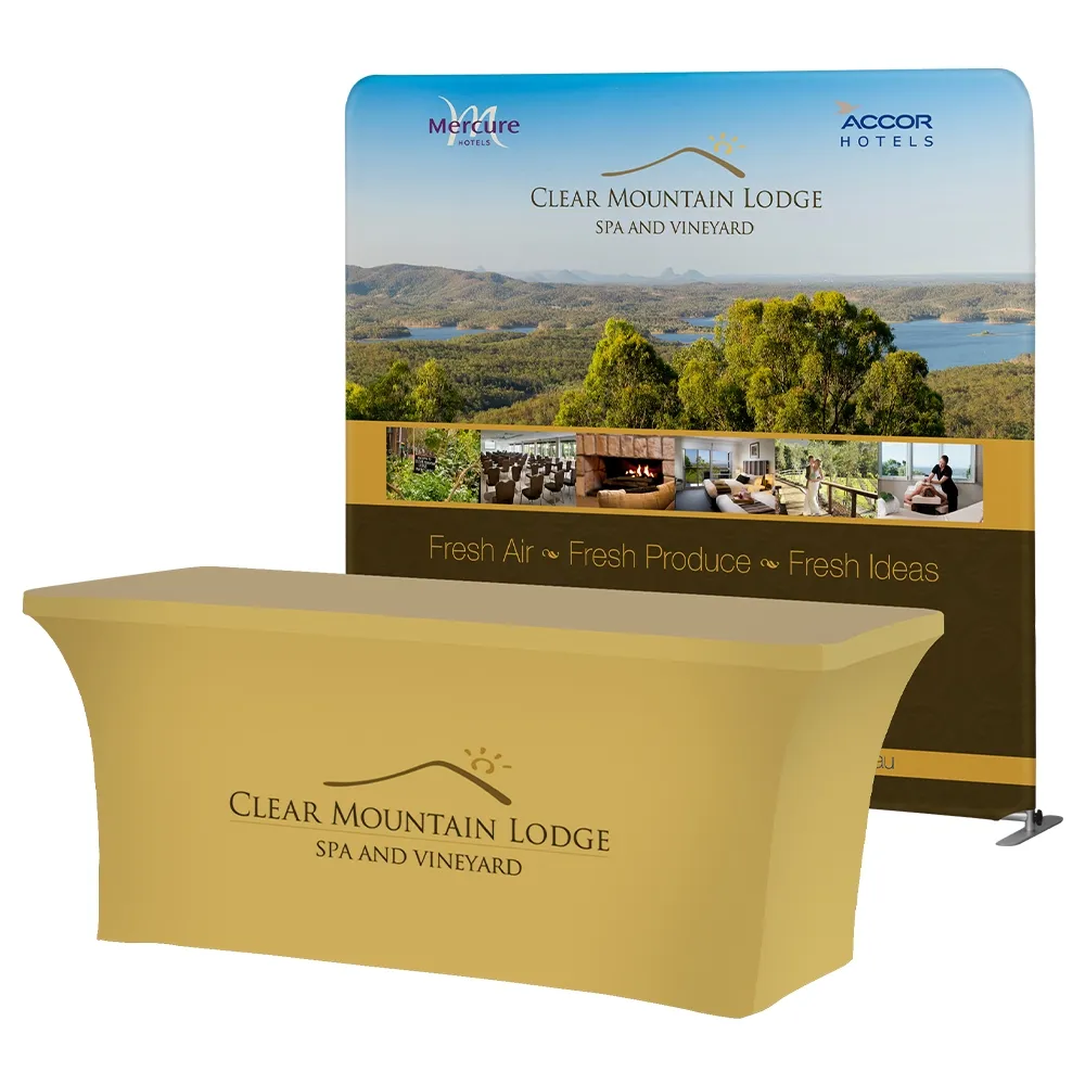 The fabric exhibition displays are able to be used in tandem by clamping the backdrop to the table with the included hardware to get a taller display that can be seen from across a room. You can also use the pieces separately, leaving plenty of space on the table to interact with customers or place merchandise and informational materials for potential patrons to purchase and go over!