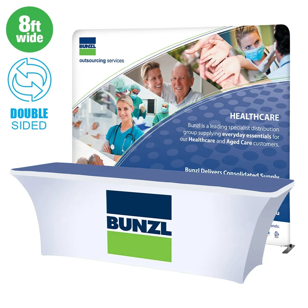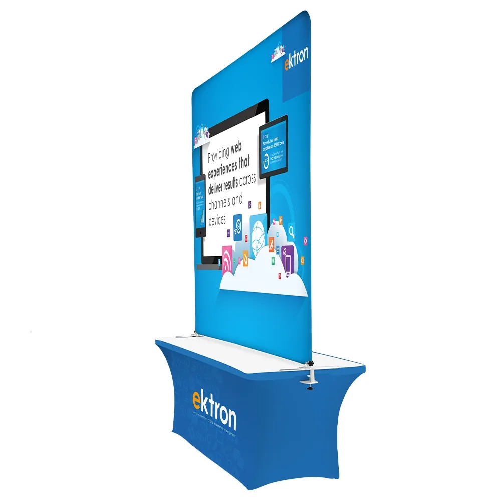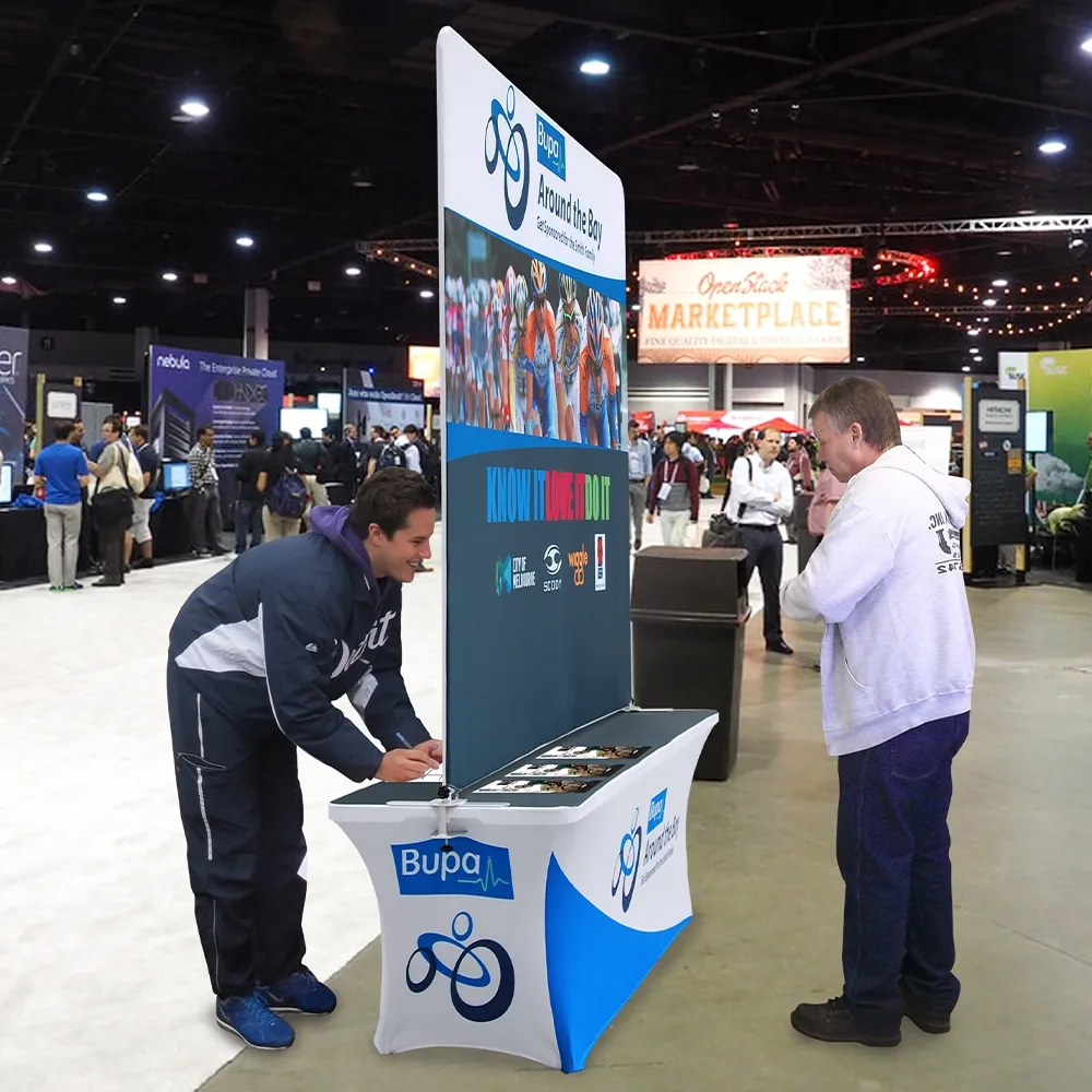 A trade show backdrop, like a portable exhibition booth & custom fabric banner stands, is a versatile display that allows you to use each component together or separately depending on your current business needs. The tradeshow displays can be used to fill out a booth or as an eye-catching item when displayed at retail stores. You can also use the custom exhibit stand as a singular unit, with the included clamps securing the display to a table.