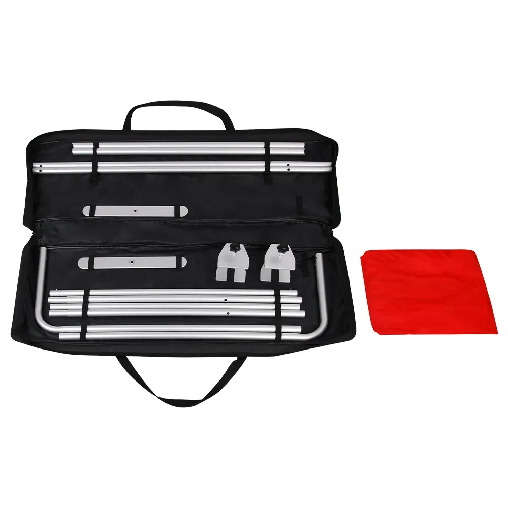 Trade show kits, portable displays, and other exhibition display stands use a 4-sided stretch tablecloth that tightly grips the table on all sides. This allows additional stock, promotional displays, and personal items to be kept out of sight beneath the 2438 x 735 x 762mm table during presentations and interactions for a more professional appearance. The 8 ft table has a folding design to make transport easier, with a built-in handle for carrying the 10kg table. There is also a nylon carrying bag included that holds the other components for not only transporting between events but also provide a safe area during storage that prevents dust and grime buildup.