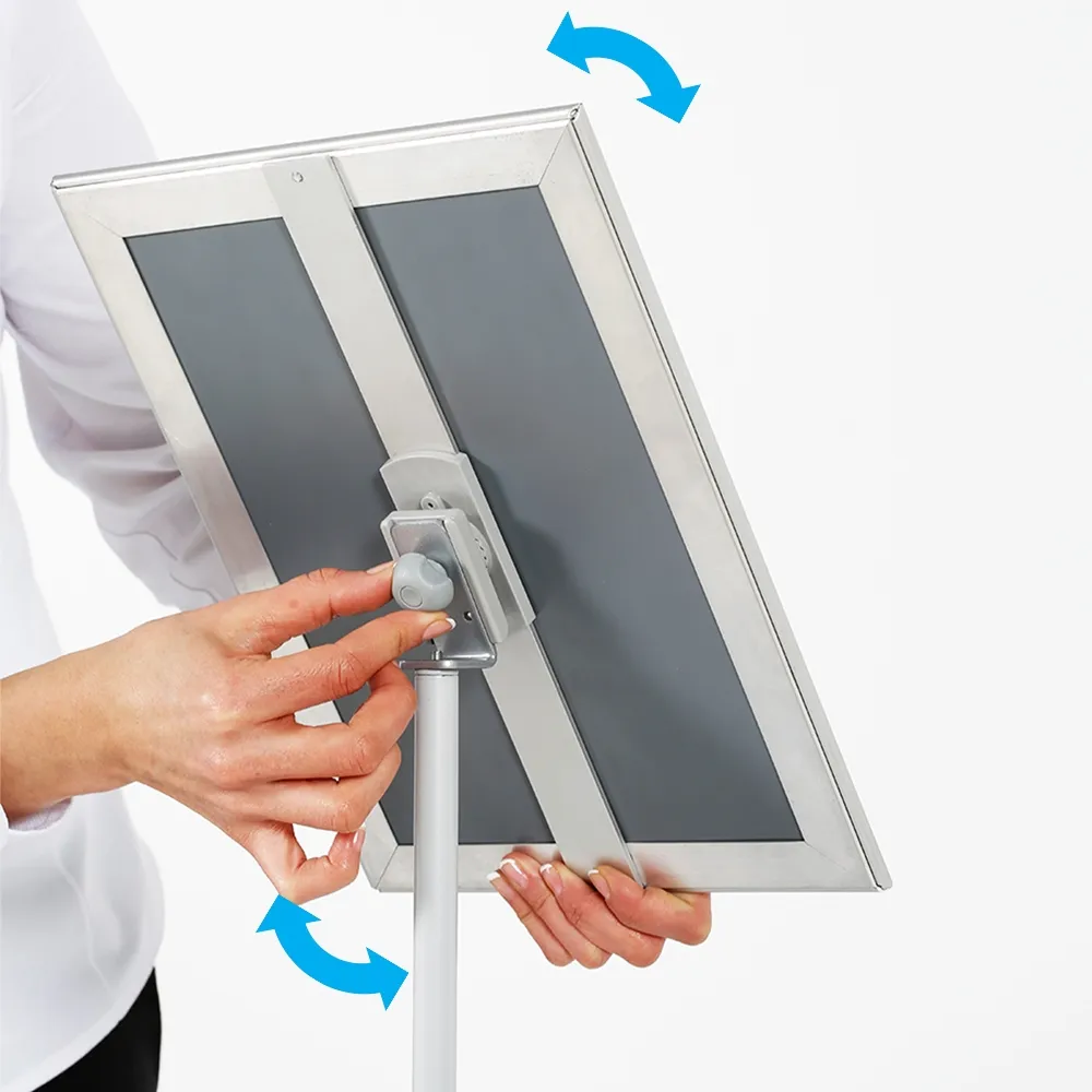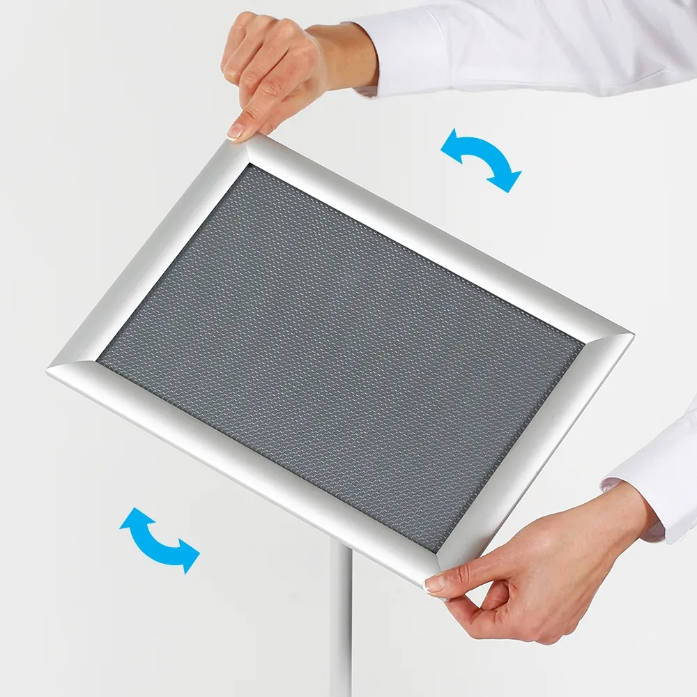 This A4 holder stand, one of many freestanding poster holders, is meant to hold an A4 (210 x 297mm) poster in either portrait or landscape orientation. The back of the frame utilises a knob that makes it easy to rotate the frame into either format depending on how posters are designed to be viewed. The signage frame itself has a snapper design for quick poster changes in seconds with no tools needed! There is also a PET lens provided to help protect the on display poster from gathering grime or dust whilst also deterring vandalism.